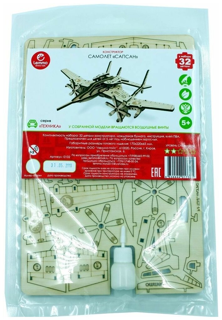 Конструктор деревянный Lemmo Самолет Сапсан, 32 дет., арт.0102, пакет