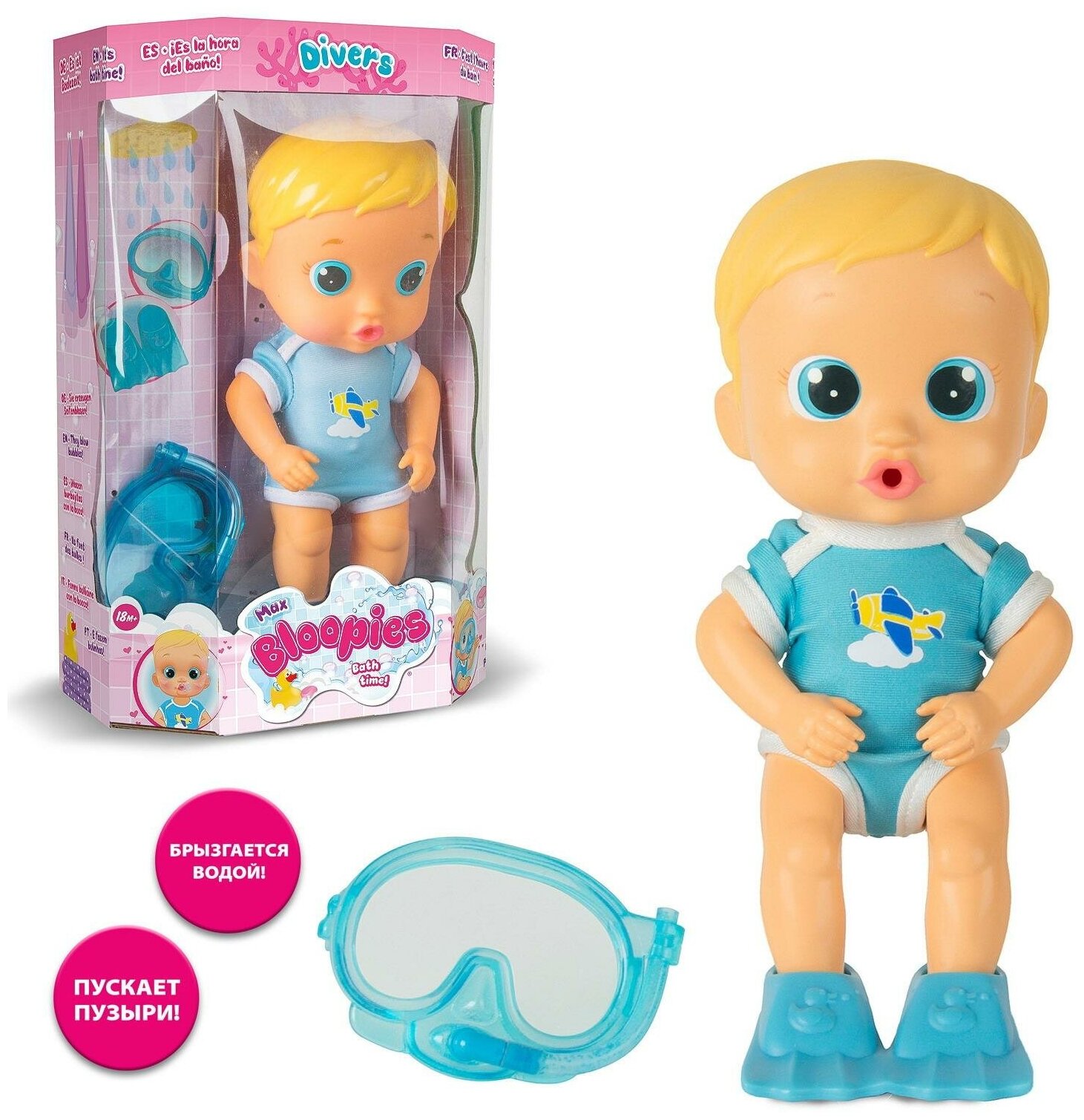 | Дополнительная информация | брызгается водой изо рта, если надеть маску, то через трубку в маске; в наборе кукла, маска, ласты; одежда не снимается |
