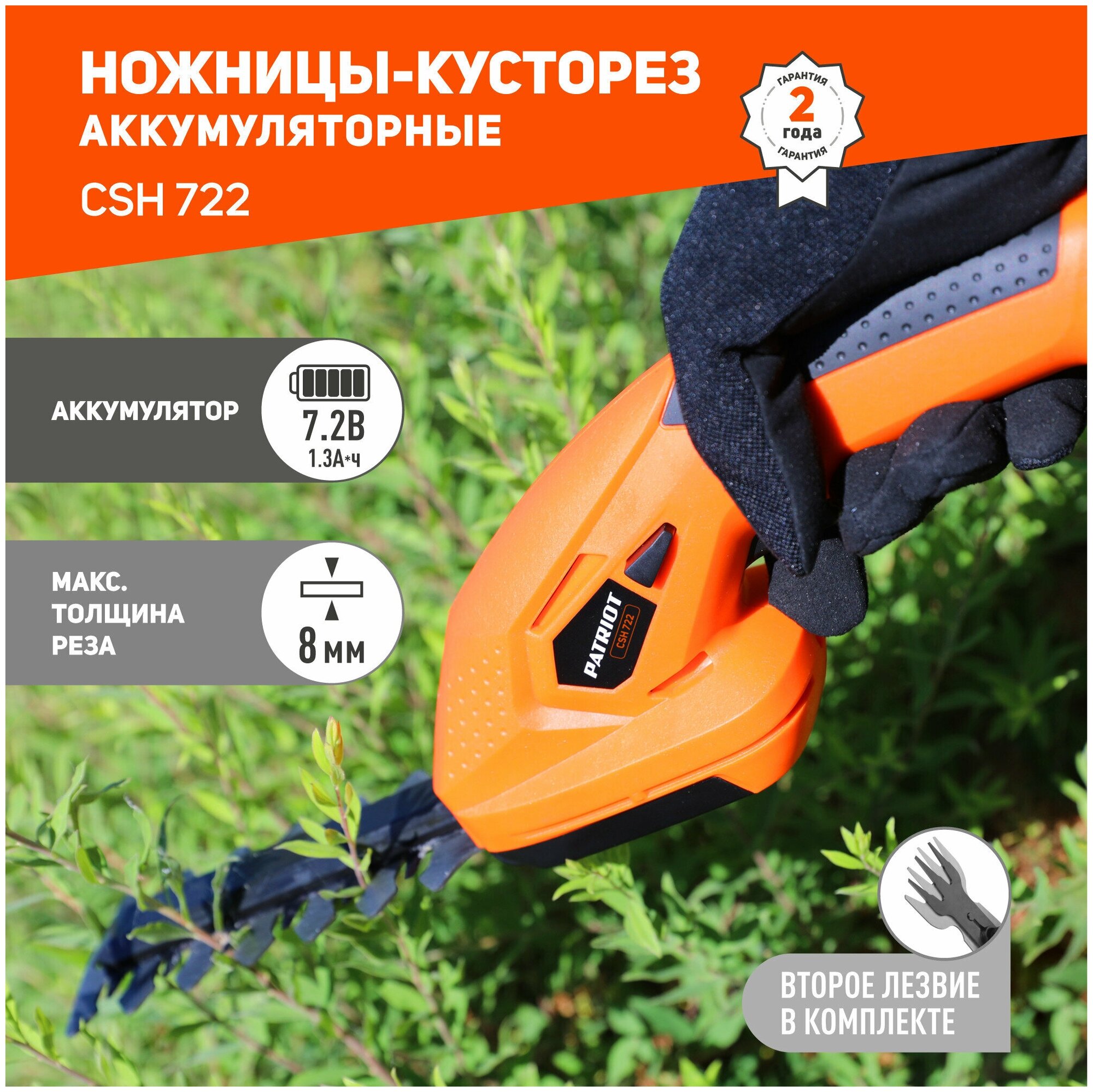 Ножницы-кусторез аккумуляторный PATRIOT CSH 722, 1.3 А·ч, 7.2 В, с АКБ и ЗУ