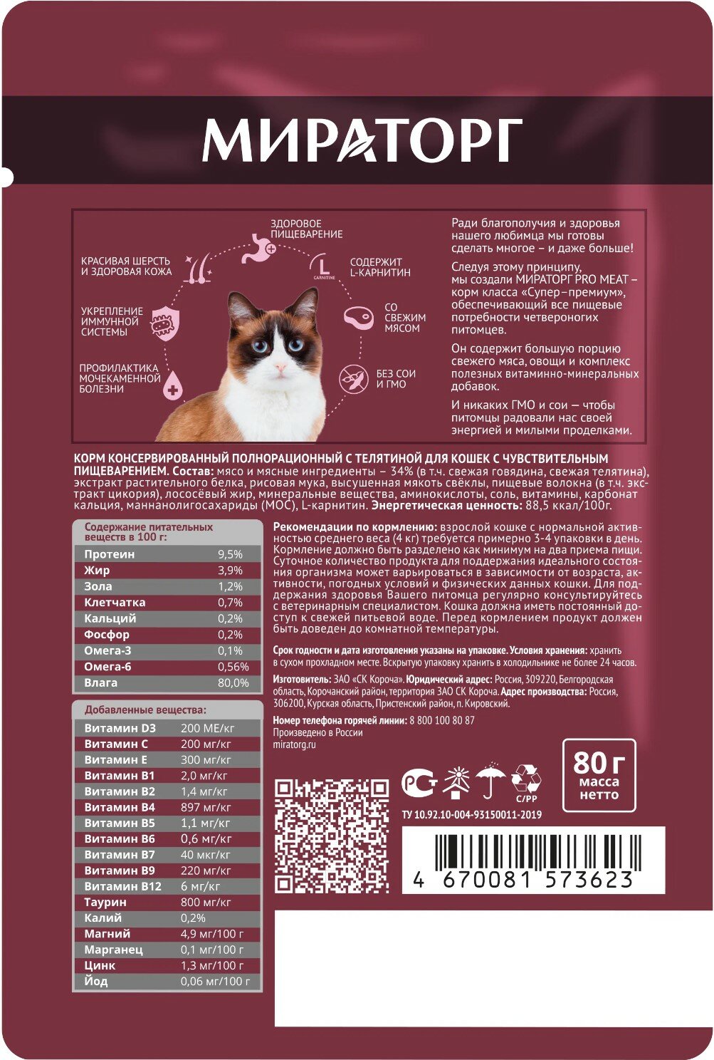 Влажный корм Мираторг Pro Meat для любых кошек с чувствительным пищеварением, телятина в соусе 1 шт х 80 г информация: