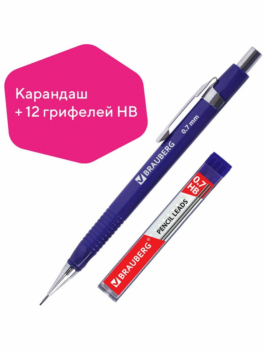Набор BRAUBERG: механический карандаш, трёхгранный синий корпус + грифели HB, 0,7 мм, 12 шт