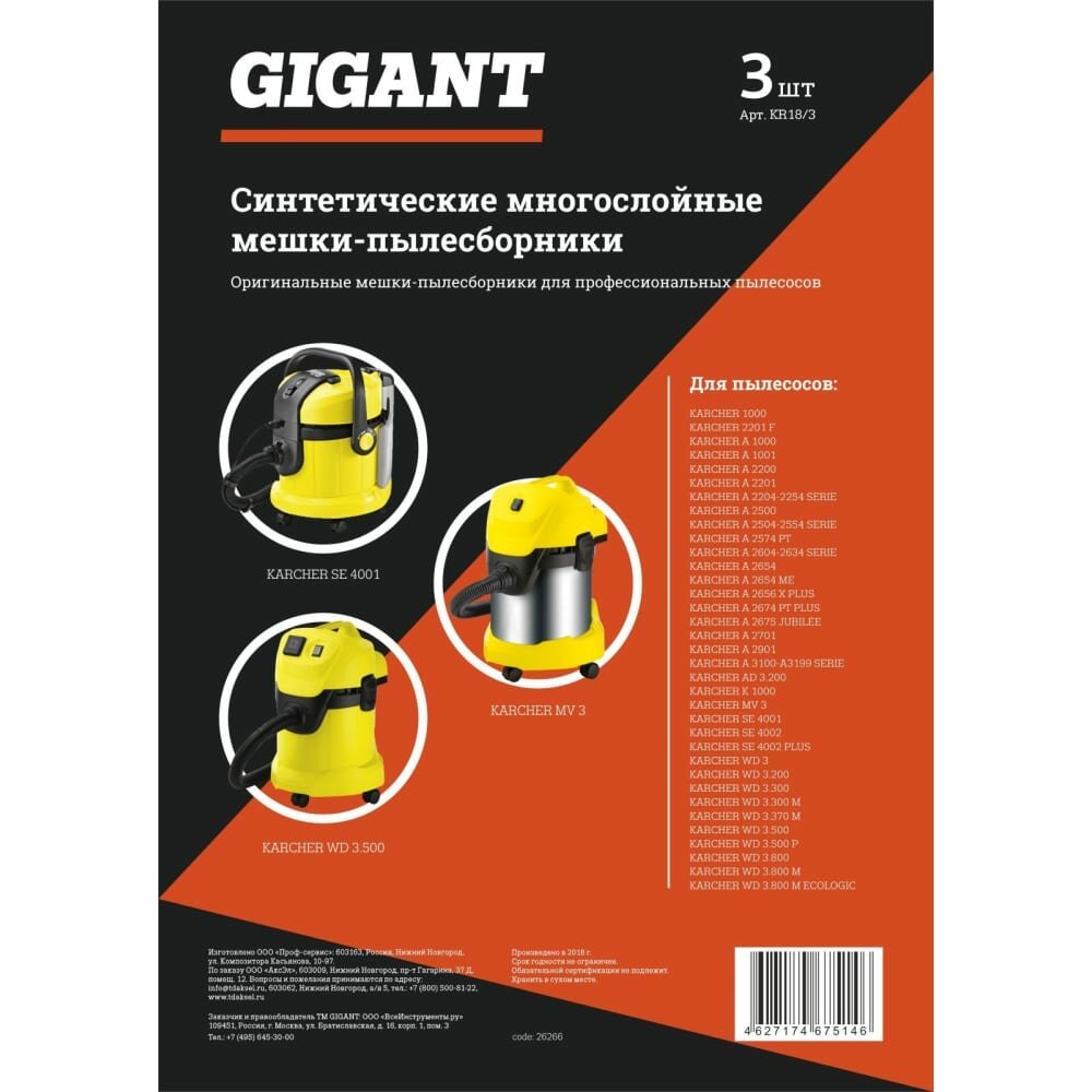 Фильтр-мешки для пылесоса KARCHER MV 3, WD 3 Gigant KR18/3 информация: