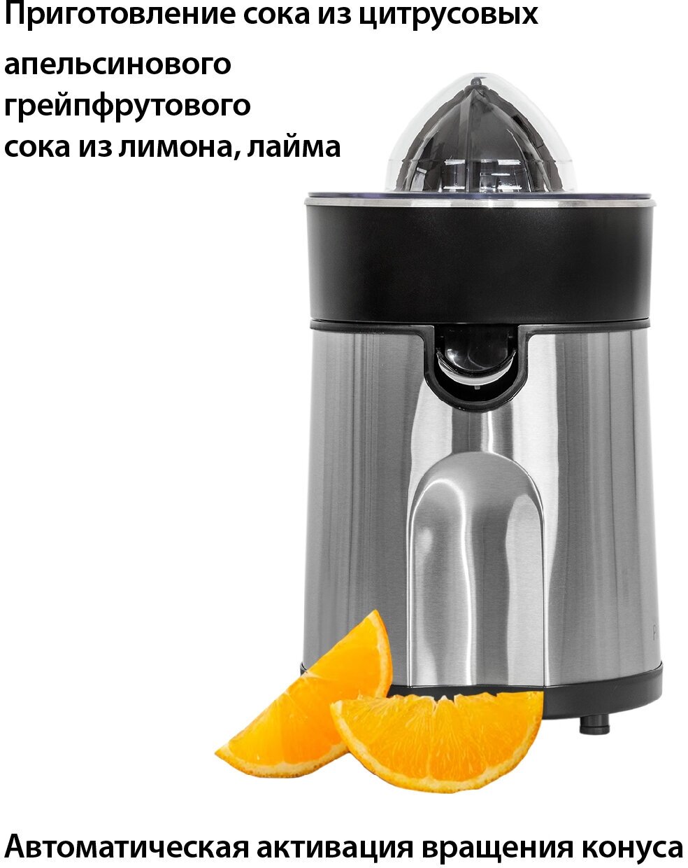 Соковыжималка для цитрусовых Pioneer с автовращением конуса, 2 насадки, фильтр из нержавеющей стали, носик с защитой от капель, 85 Вт