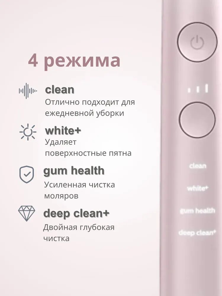| Дополнительная информация | 4 режима: Clean (Чистка) — для качественной ежедневной чистки зубов, White+(Осветление) — для удаления потемнений, Gum Health (Здоровье десен) — для бережной и эффективной чистеи десен, Deep Clean+ (Глубокая чистка) — для самой тщательной чистки |