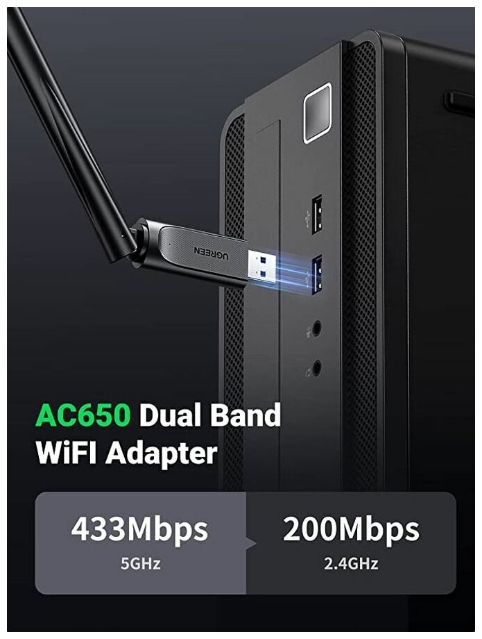 Wi-Fi адаптер UGREEN CM496 (90339) AC650 High-Gain Dual Band Wireless USB Adapter. Цвет: черный