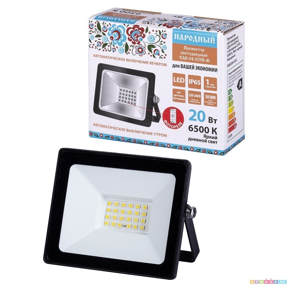 Прожектор светодиодный СДО-04-020Н-Ф (с фотореле) 20 Вт, 6500 К, IP65, черный, Народный