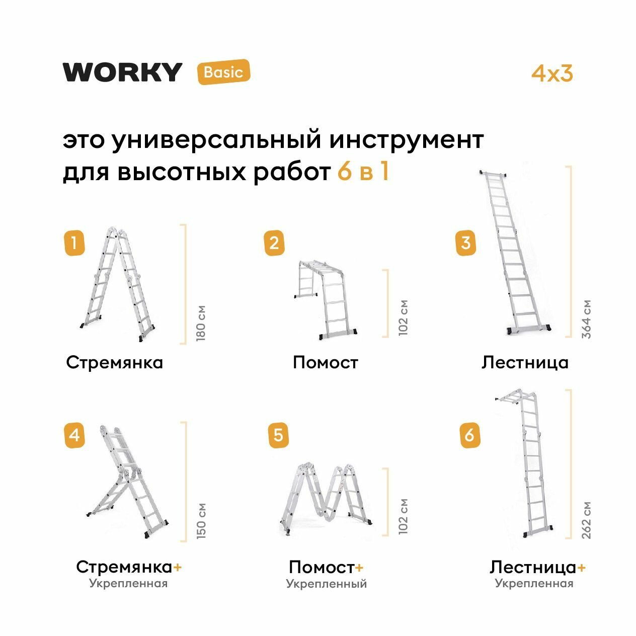 Лестница-стремянка 4x3 трансформер WORKY Basic, с увеличенной высотой 3,7м информация: