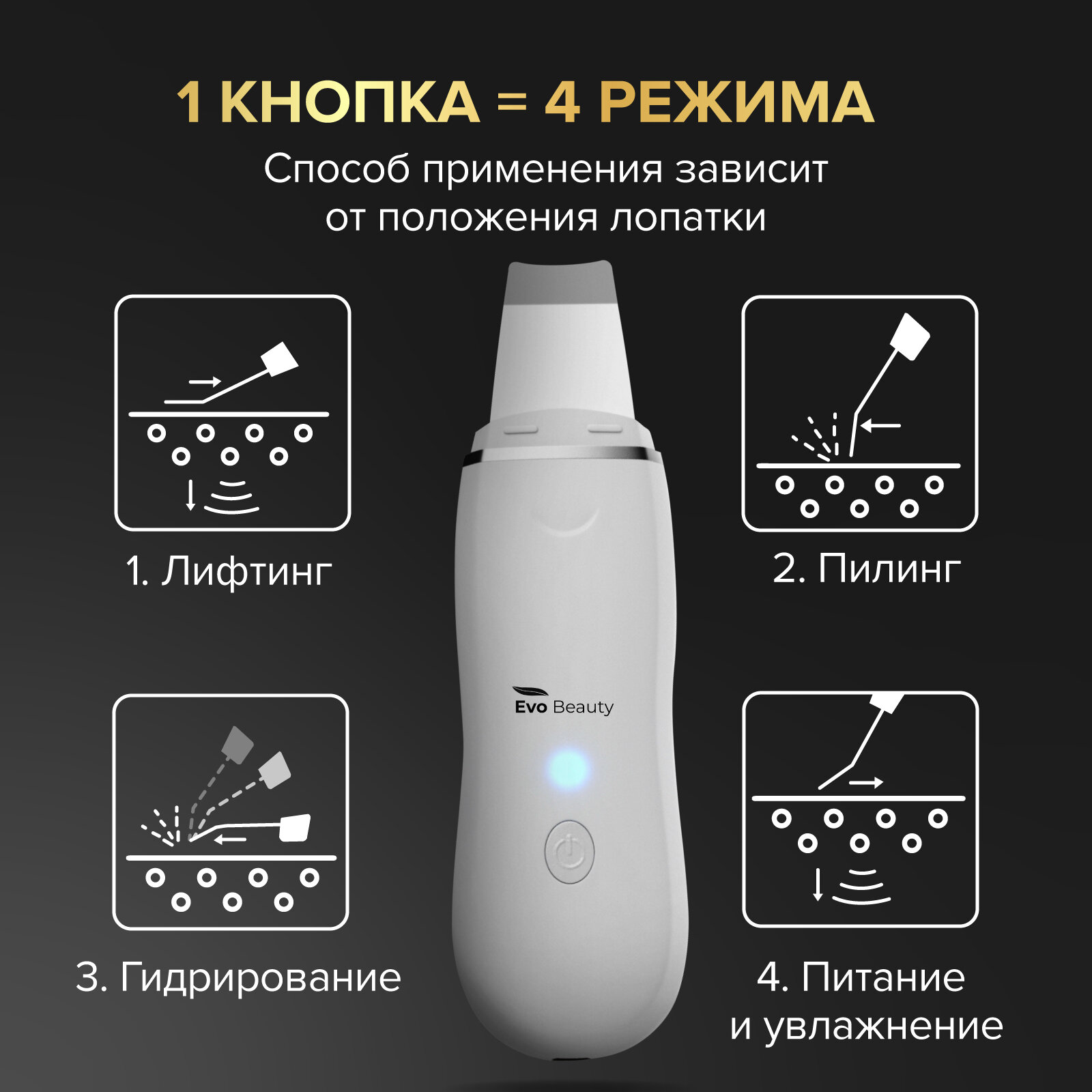 Аппарат для ультразвуковой чистки лица. Лифтинга, фонофорез, глубокое очищение кожи. Домашний аппарат Evo Beauty информация:
