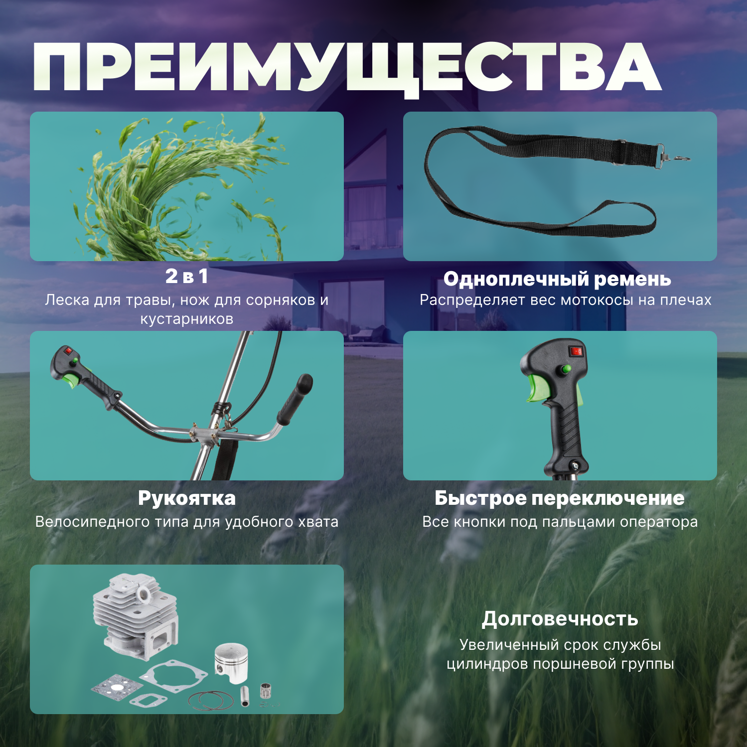 | Подробная комплектация | мотокоса в разборе, инструкция по эксплуатации, одночленный ремень, косильная головка, трехлопастной нож, набор инструментов, емкость для приготовления топливной смеси |