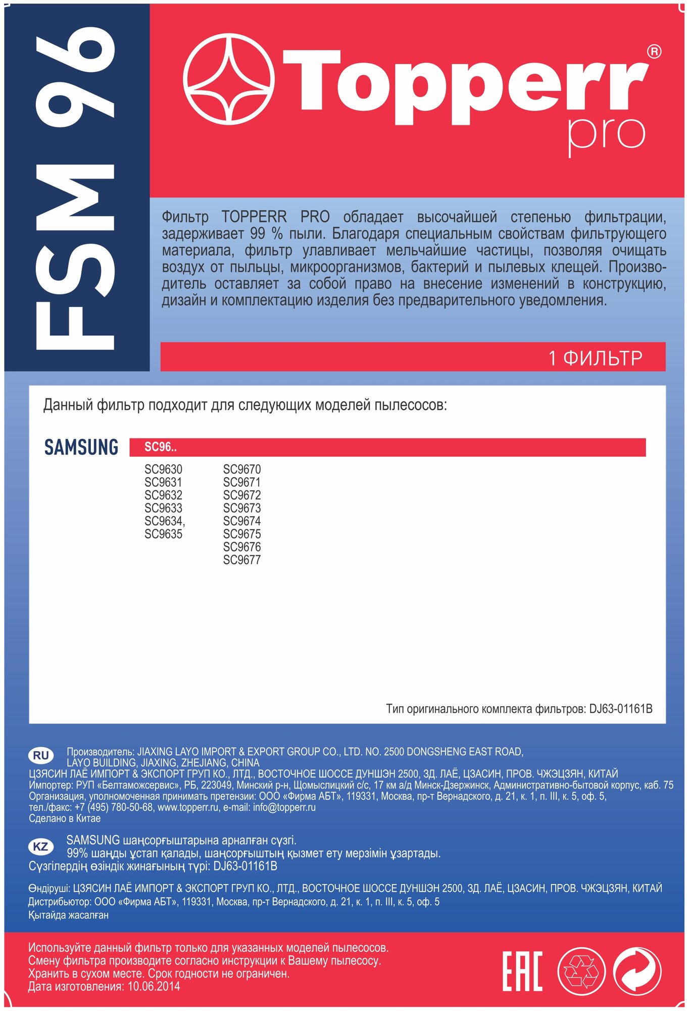 Губчатый фильтр Topperr FSM 96 для пылесосов Samsung информация: