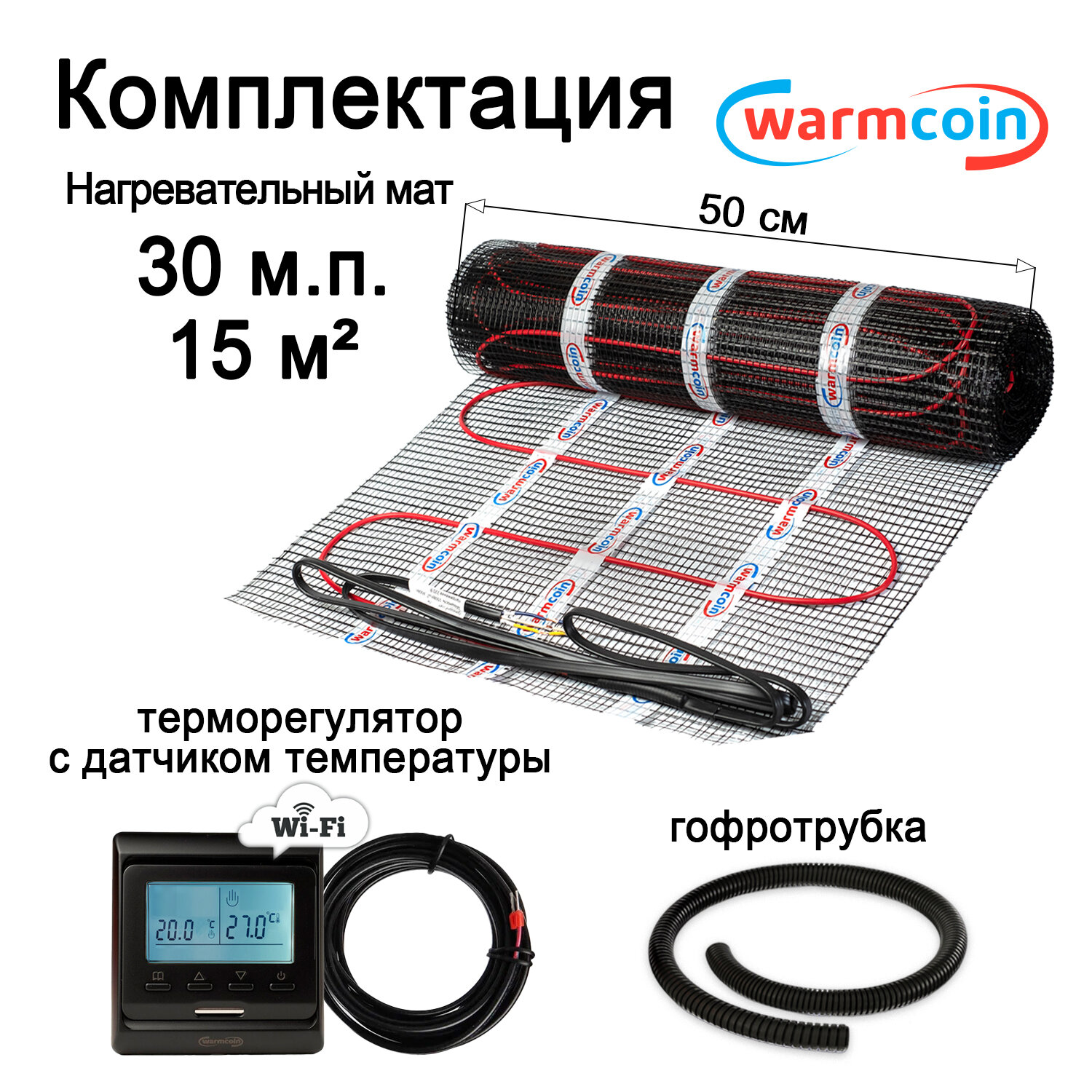 Теплый пол электрический Warmcoin BLACK с терморегулятором W51 Wi-Fi черным 15 м.кв. информация: