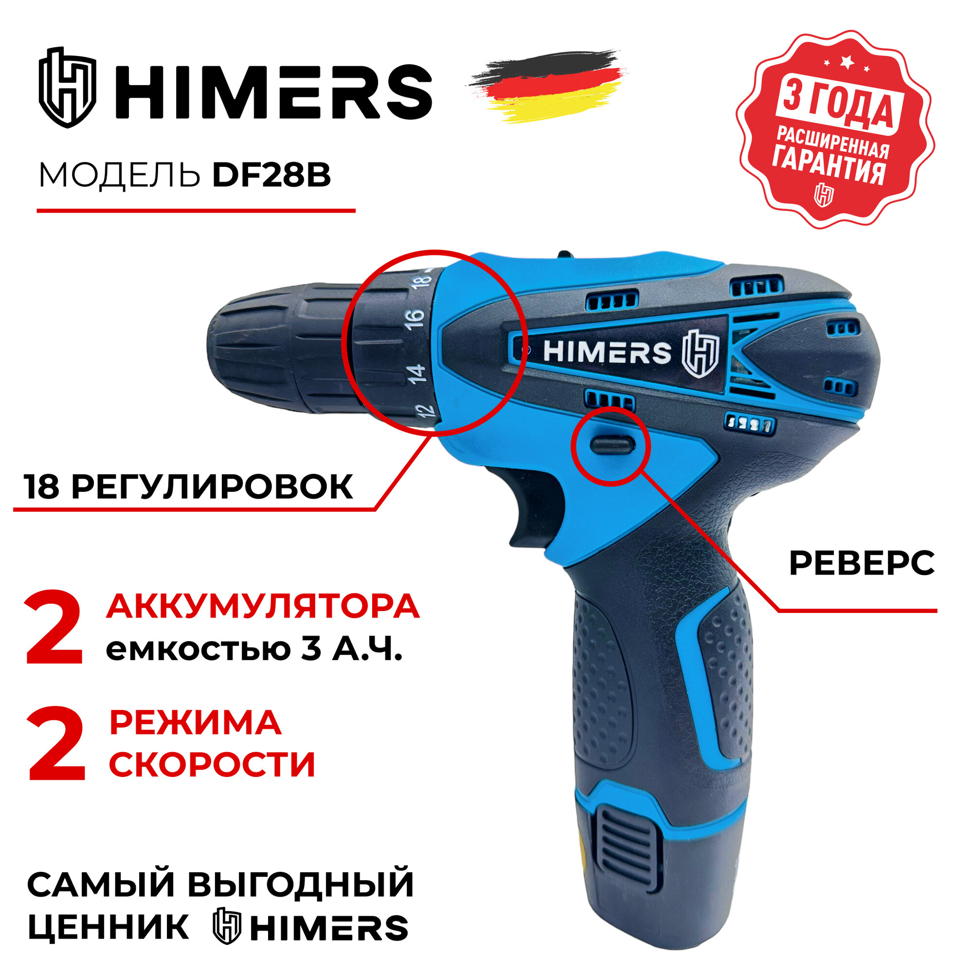 Отзывы на Шуруповерт HIMERS DF28B аккумуляторный 12V, 2 АКБ по 3 А.ч., 25 Н.м., Кейс с набором бит, свёрел, головок инструментов 24 предмета / для сверления, закручивания 12в