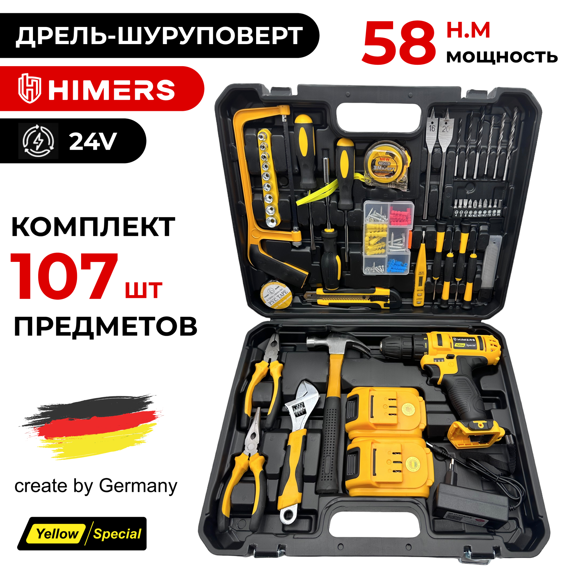 Дрель - шуруповерт HIMERS DF58Y PRO аккумуляторный 24V, 2 АКБ, 58 Н.м / Версия Yellow special / Кейс с набором бит, свёрел, головок инструментов 107 предметов / для сверления, долбления, закручивания 24В информация: