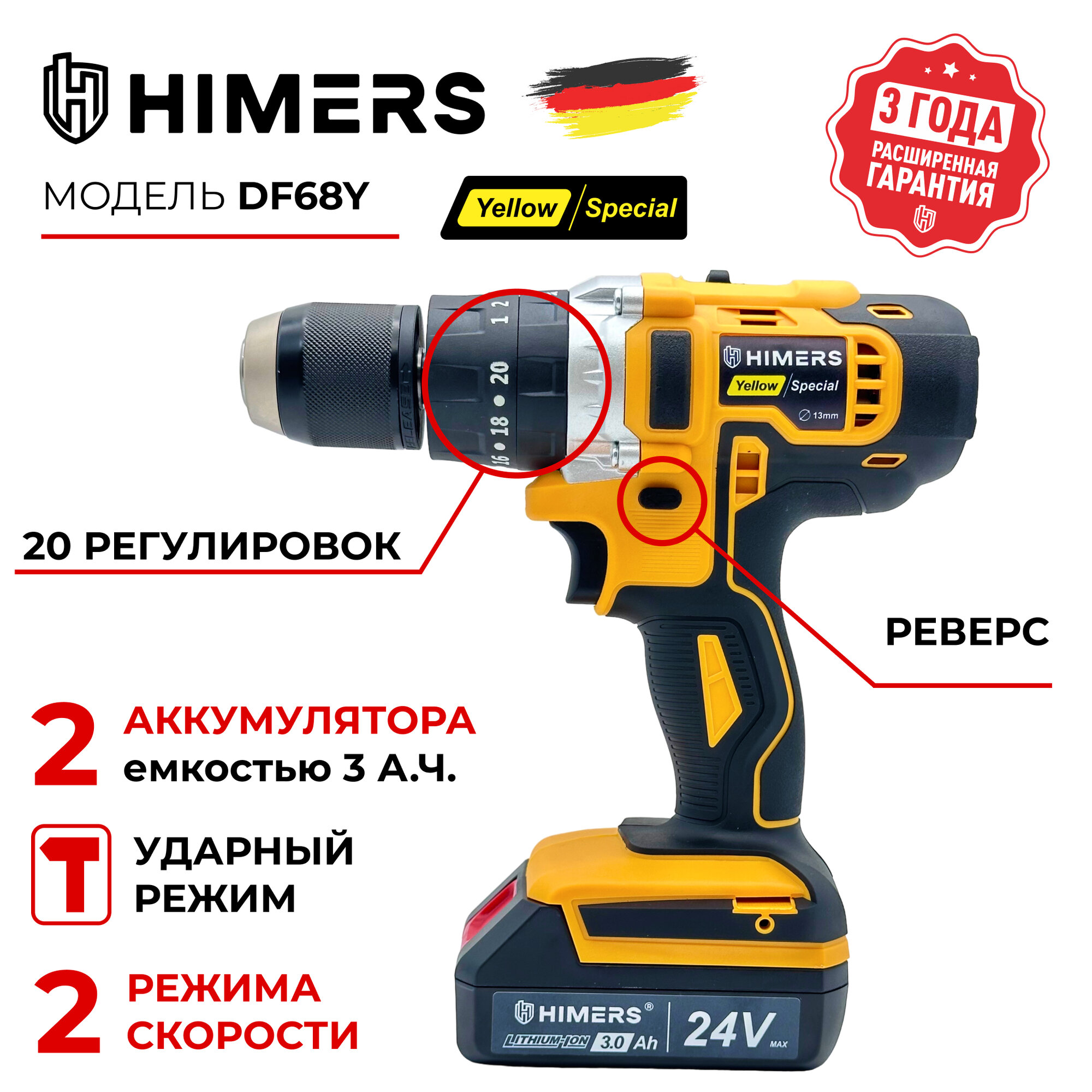 10 цен на Ударный шуруповерт HIMERS DF68Y аккумуляторный 24V, 2 АКБ по 3 А.ч., 68 Н.м., Версия Yellow special / Кейс / для сверления, закручивания 24в