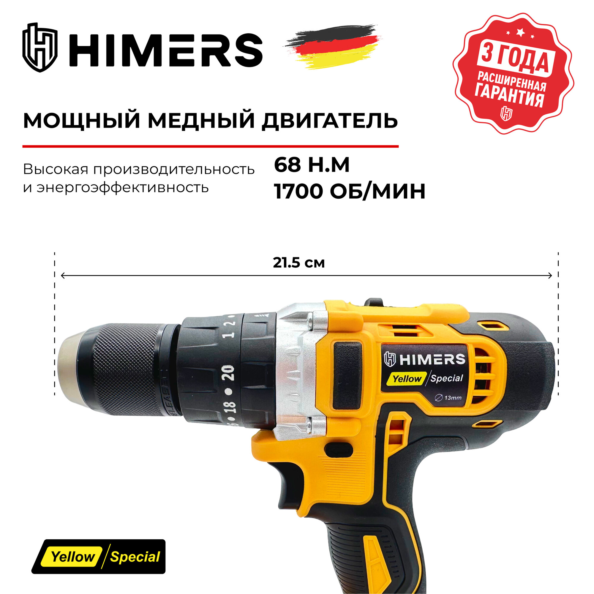 Бесщеточный шуруповерт HIMERS DF65Y-BL аккумуляторный 18V, 2 АКБ по 3 А. ч, 65 Н. м, 10мм патрон, Версия Yellow special / Кейс / многофункциональный для сверления, закручивания 18в 7 722 ₽