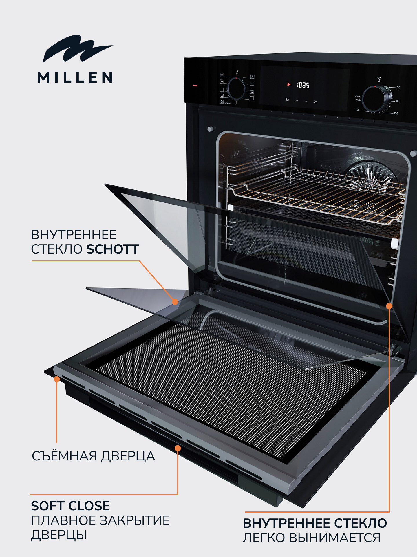 10 цен на Духовой шкаф встраиваемый, электрический MILLEN MEO 6003 BB, Таймер,Отделка Стекло,Объем 78 л,Направляющие Телескопические,1 противень, 1 противень FRYART, 1 решетка,Размер для встраивания 600х560х550 мм