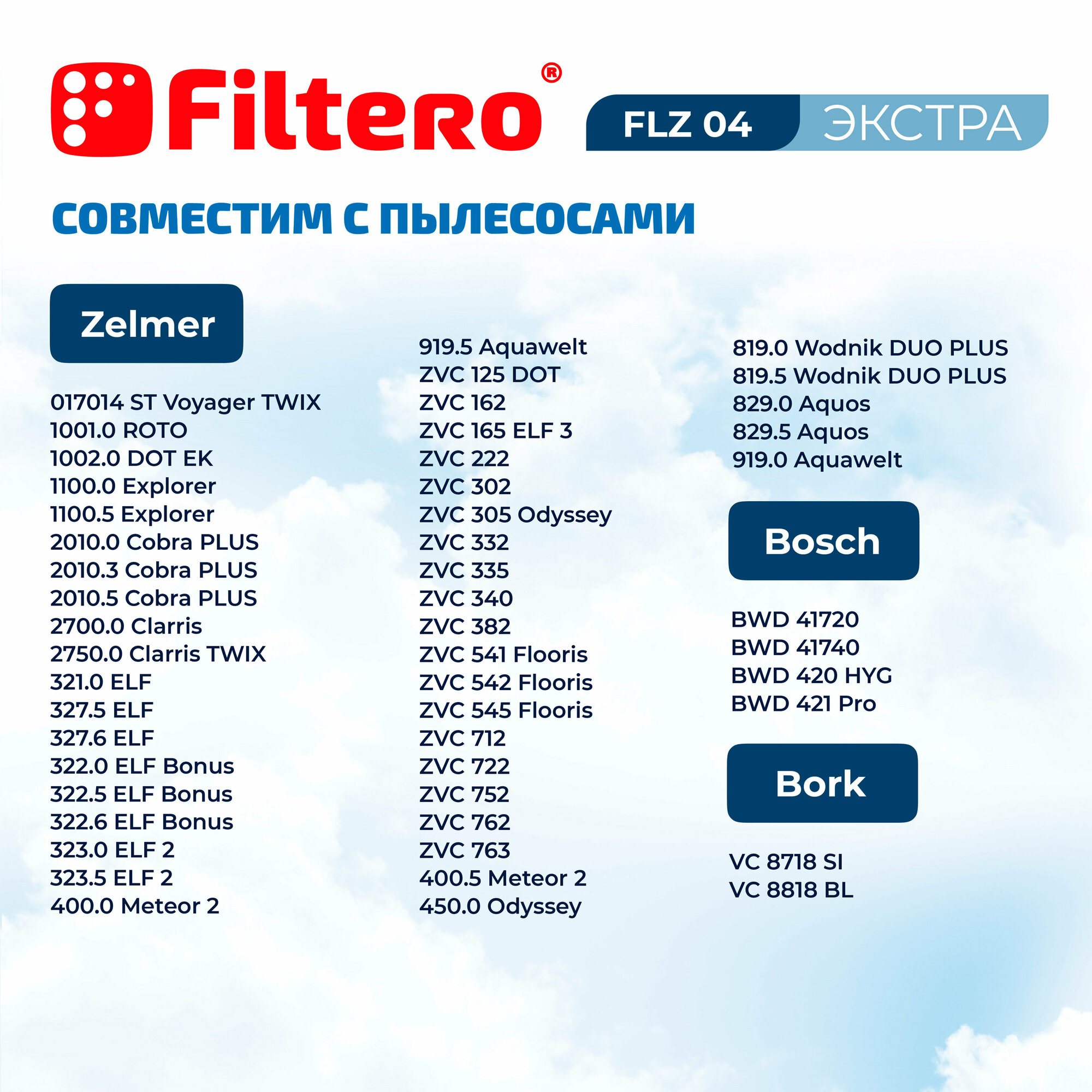 | Совместимые модели | ZELMER 01Z014 ST Voyager Twix, 321.0 Elf, 321.5 Elf, 321.6 Elf, 322.0 Elf Bonus, 322.5 Elf Bonus, 322.6 Elf Bonus, 323.0 Elf 2, 323.5 Elf 2, 400.0 Meteor 2, 400.5 Meteor 2, 450.0 Odyssey, 819.0 Wodnik Duo Plus, 819.5 Wodnik Duo Plus, 829.0 Aquos, 829.5 Aquos, 919.0 Aquawelt, 919.5 Aquawelt, 1001.0 Roto, 1002.0 Dot EK, 1100.0 Explorer, 1100.5 Explorer, 2010.0 Cobra Plus, 2010.3 Cobra Plus, 2010.5 Cobra Plus, 2700.0 Clarris, 2750.0 Clarris Twix, ZVC 125 Dot, ZVC 162, ZVC 165 Elf 3, ZVC 222, ZVC 302, ZVC 305 Odyssey, ZVC 332, ZVC 335, ZVC 340, ZVC 382, ZVC 541 Flooris, ZVC 542 Flooris, ZVC 545 Flooris, ZVC 712, ZVC 722, ZVC 752, ZVC 762; BORK VC 8718 SI, VC 8818 BL; |