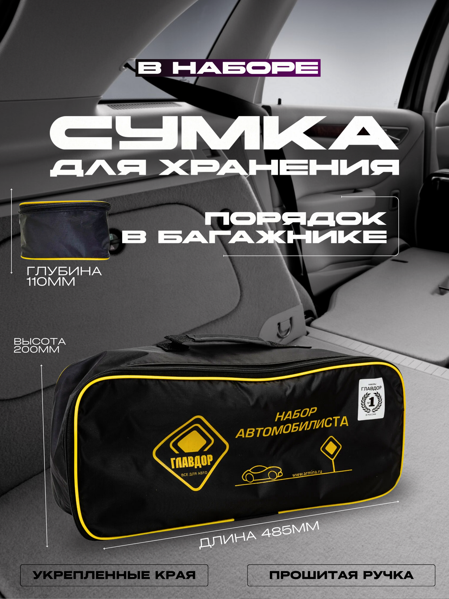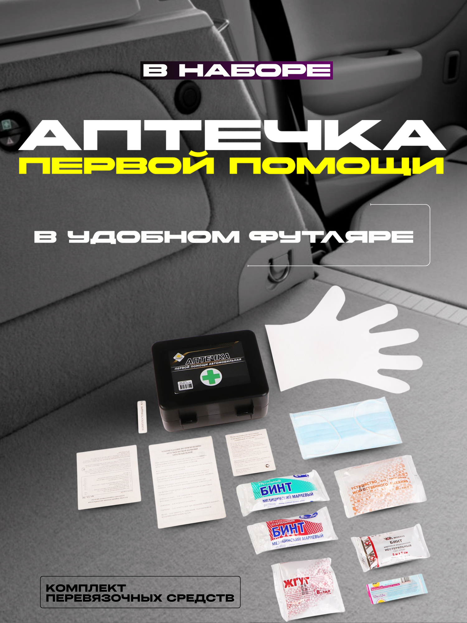 | В наборе | аптечка / жилет светоотражающий / знак аварийной остановки / огнетушитель / перчатки / пусковые провода / трос буксировочный / 7 / 7 / маска / сумка |