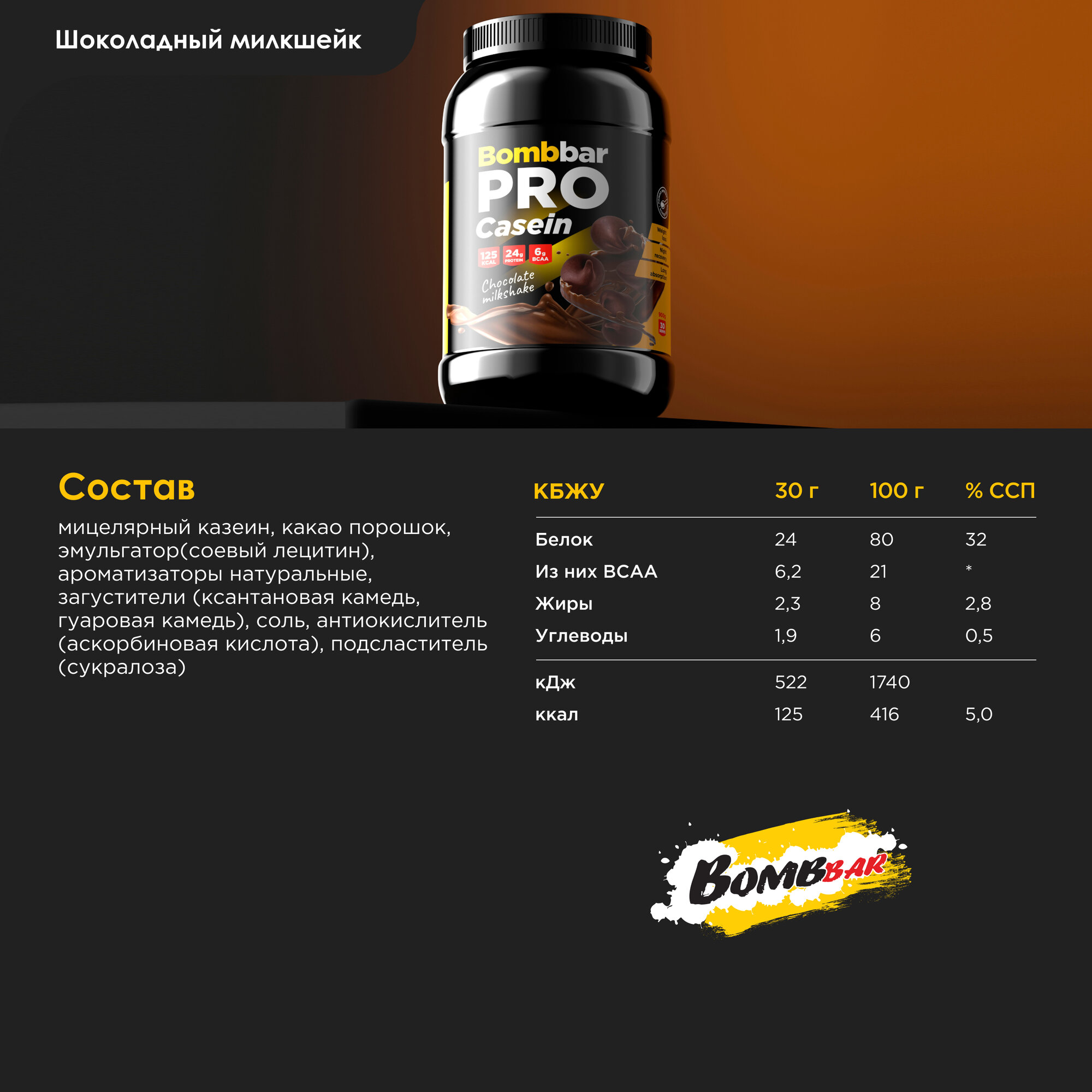 Bombbar Pro Casein Protein Казеиновый протеин без сахара "Шоколадный милкшейк", 900 г информация: