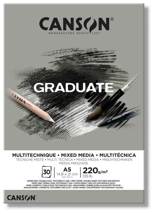 10 цен на Canson Склейка "Graduate", Mix media, по короткой, серый, 30л, A5, 220г/м2, среднезернистая