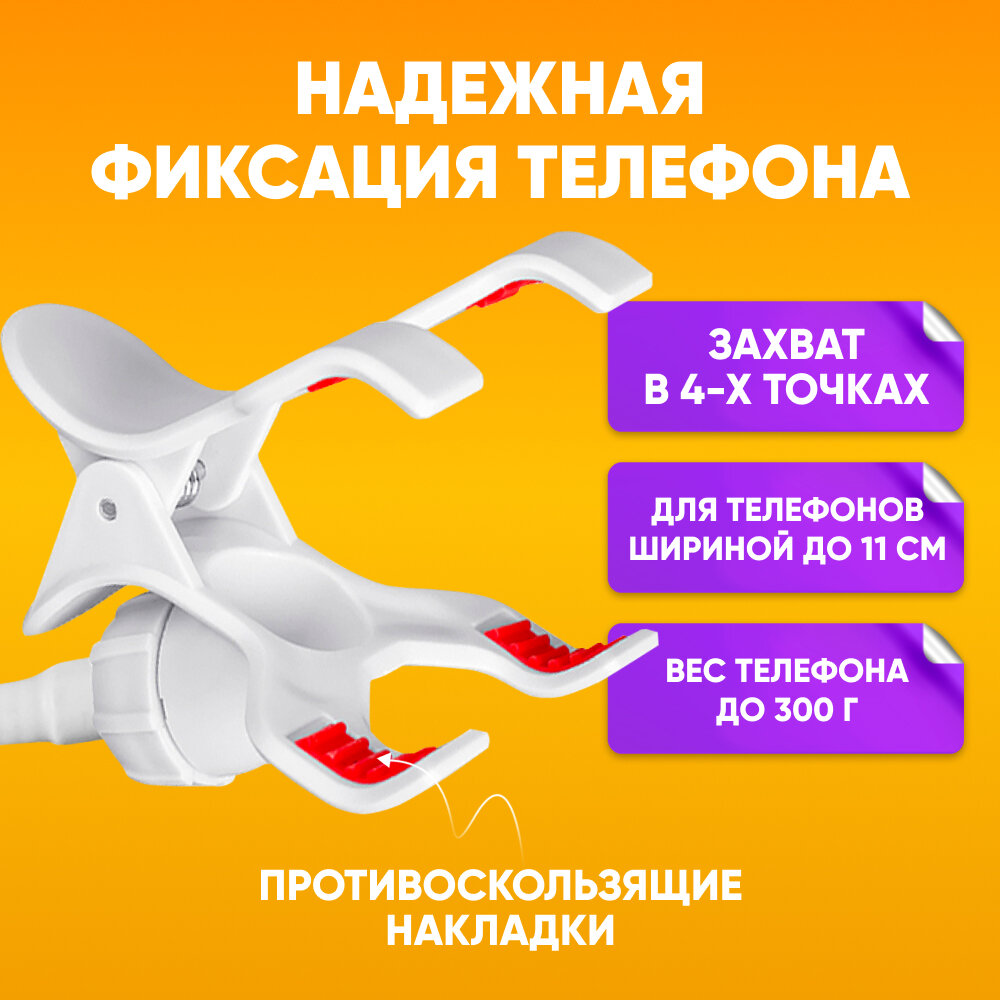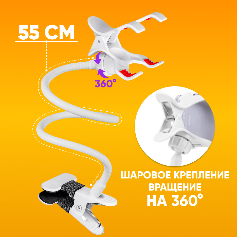 Универсальный гибкий держатель PH-1 ISA для телефона до 11 см, белый 55 см / Подставка для смартфона, шарнирное крепление, силиконовое покрытие, вращение на 360 / Крепление с прищепкой 540 ₽