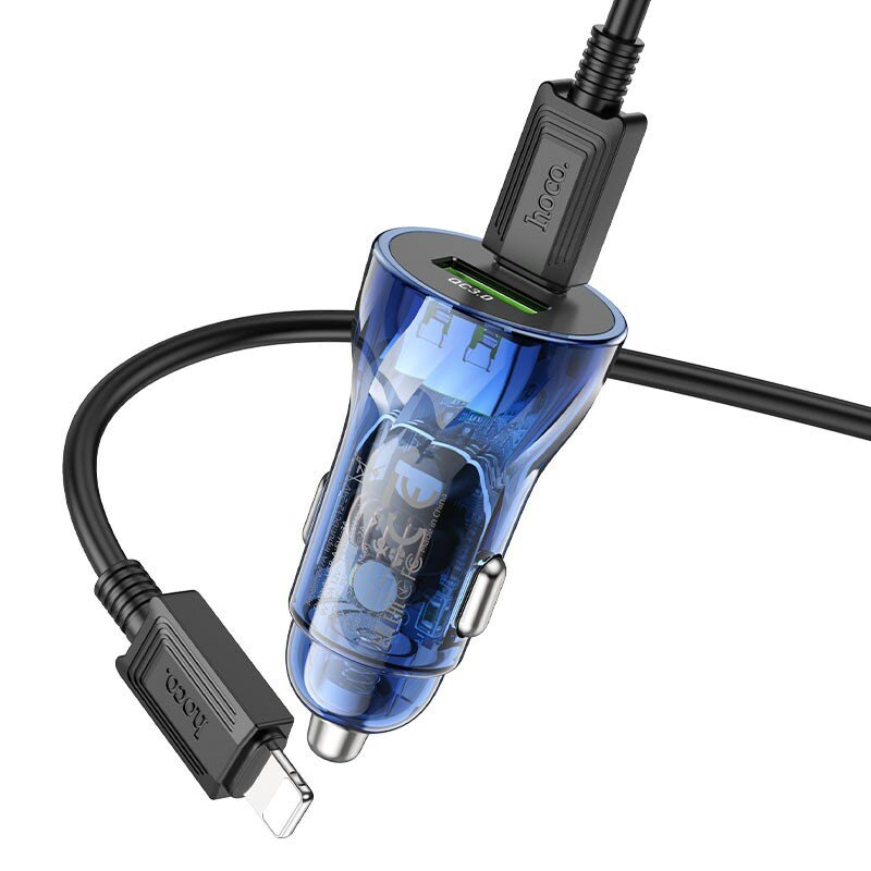 Зарядное устройство а/м 12V -> USB 5V hoco Z47A, Type-C 30W/USB 18W, PD30W, QC 3.0, + кабель Type-C -> Lightning, прозр. синее