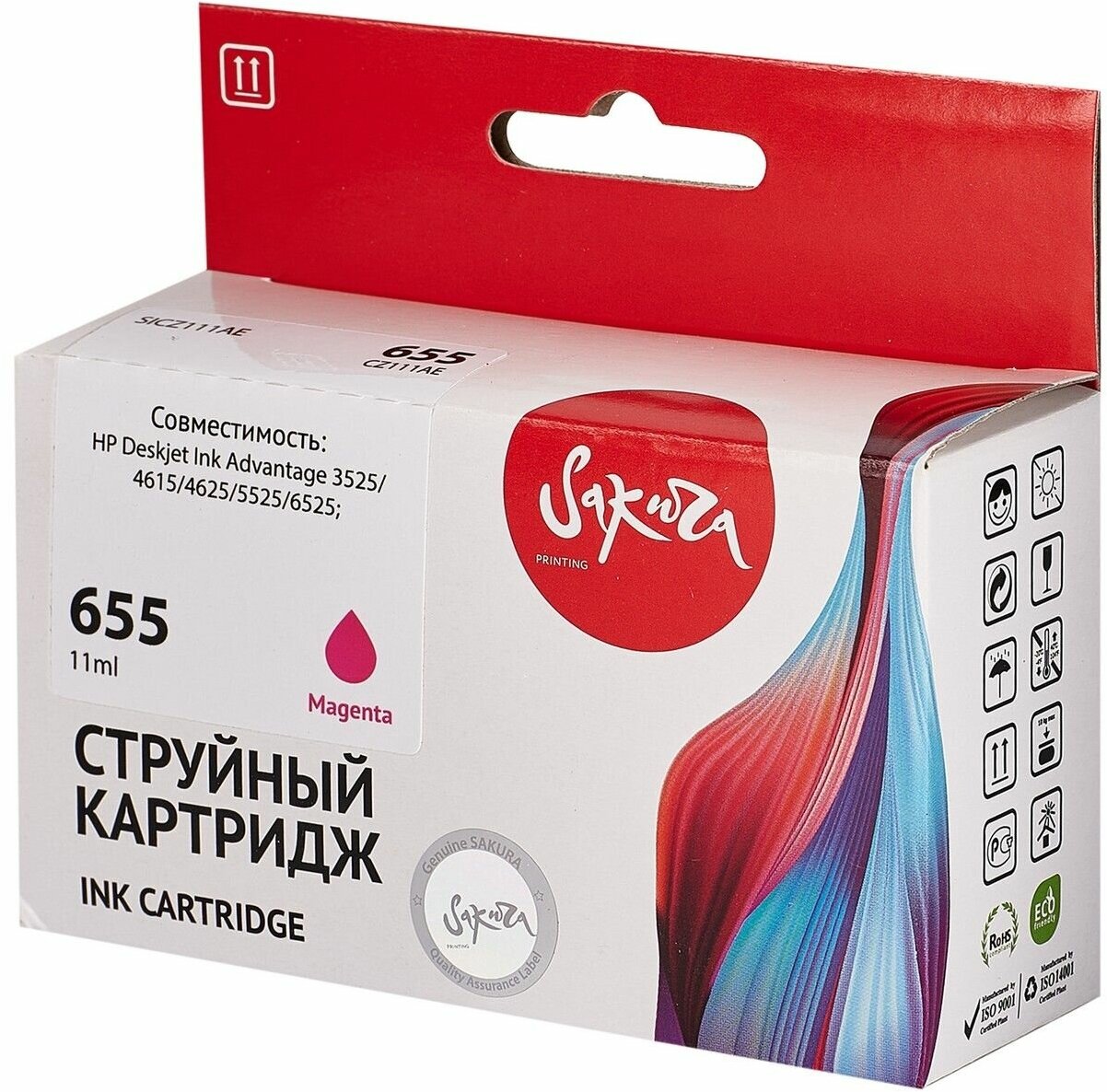 Струйный картридж Sakura CZ111AE (№655 Magenta) для HP Deskjet Ink Advantage 3525/4615/4625/5525/6525;, водорастворимый тип чернил, пурпурный, 11 мл., 600 к. 599 ₽