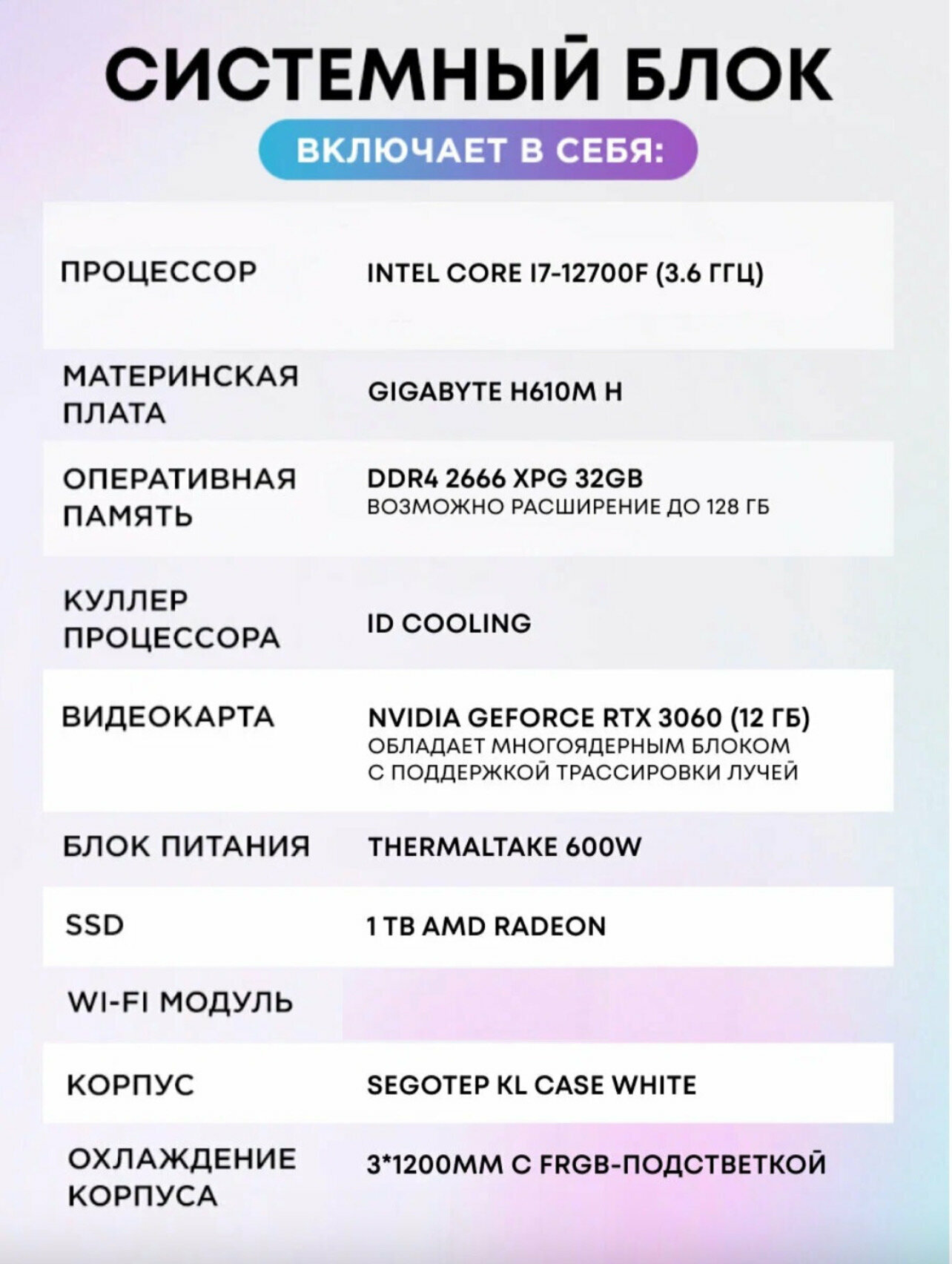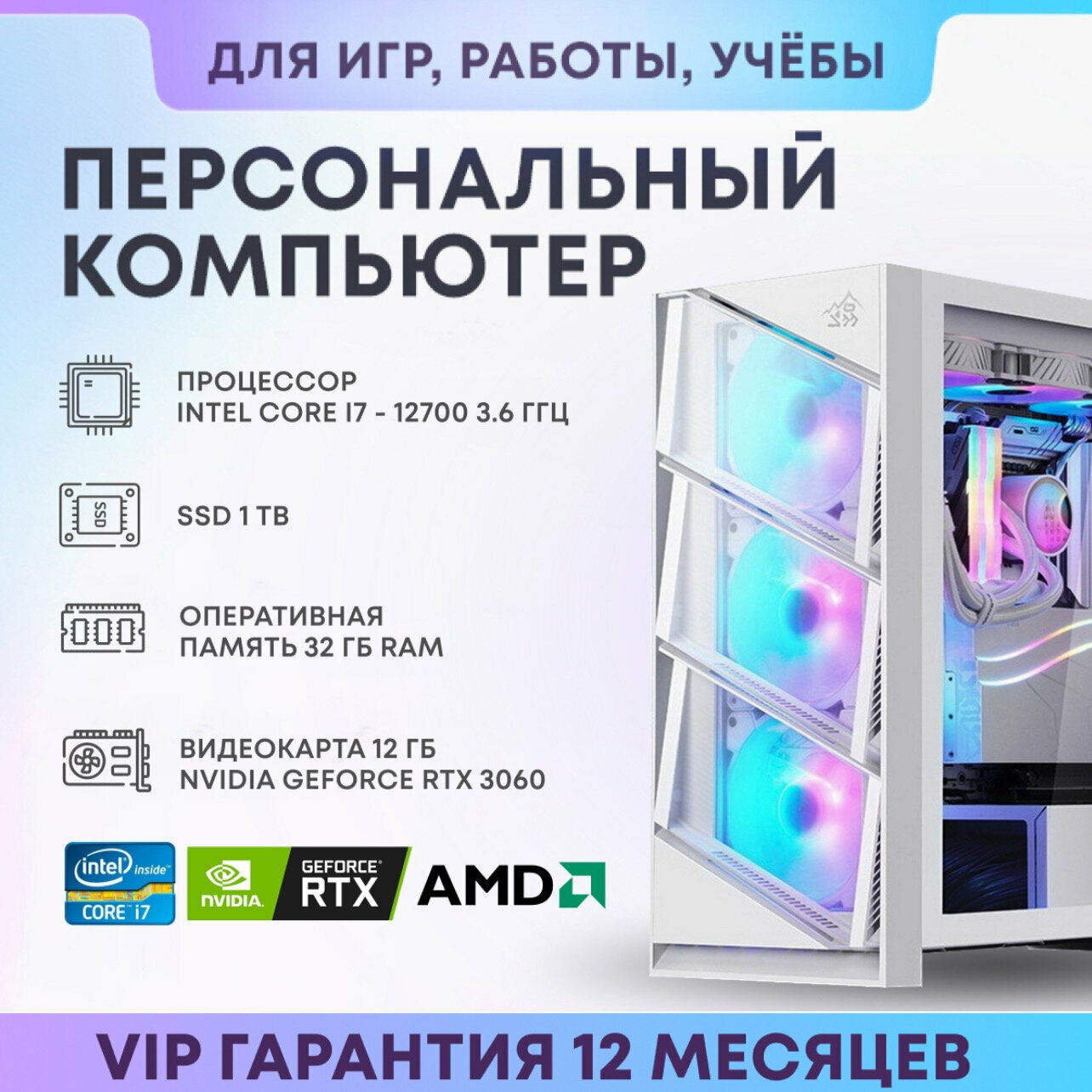 Системный блок SevenGroup Игровой компьютер ПК (Intel Core i7-12700F, RAM 32 ГБ, SSD 1 ТБ, NVIDIA GeForce RTX 3060 (12 Гб), Windows 10 PRO), белый информация: