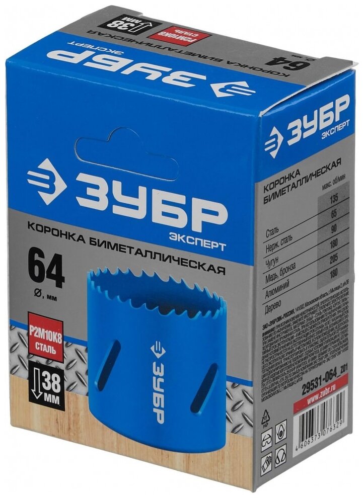ЗУБР d 64 мм, глубина сверления до 38 мм, коронка биметаллическая 29531-064_z01