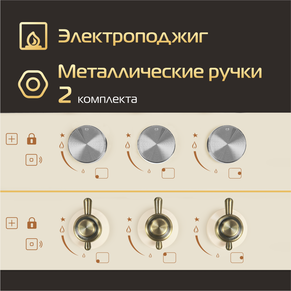 Газовая варочная поверхность HIBERG VM 3022 RY, 2 конфорки, электророзжиг, газ-контроль, бежевый ретро