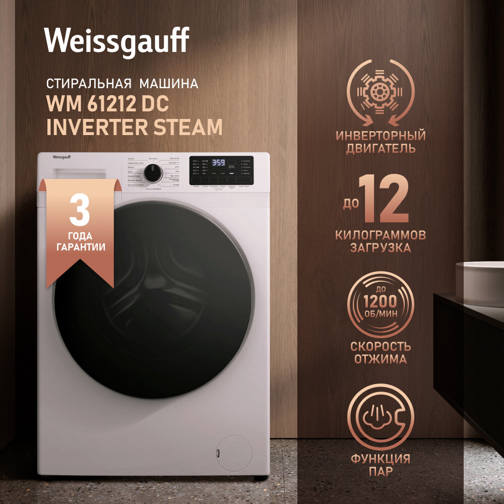 10 цен на Cтиральная машина с инвертором и паром Weissgauff WM 61212 DC Inverter Steam,3 года гарантии, Режим Умной стирки, Установка в колонну с сушильным барабаном, 1200 оборотов, блокировка от детей, А+++
