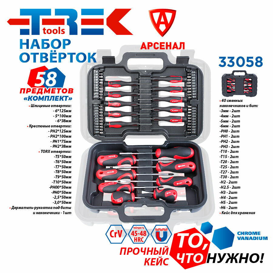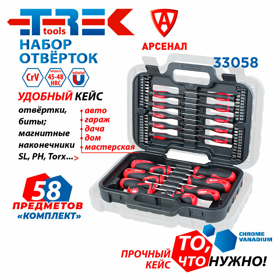 Набор отверток и бит 58 предметов в кейсе "Комплект" (магнитные наконечники SL, PH, Torx) TREK, TR33058 информация: