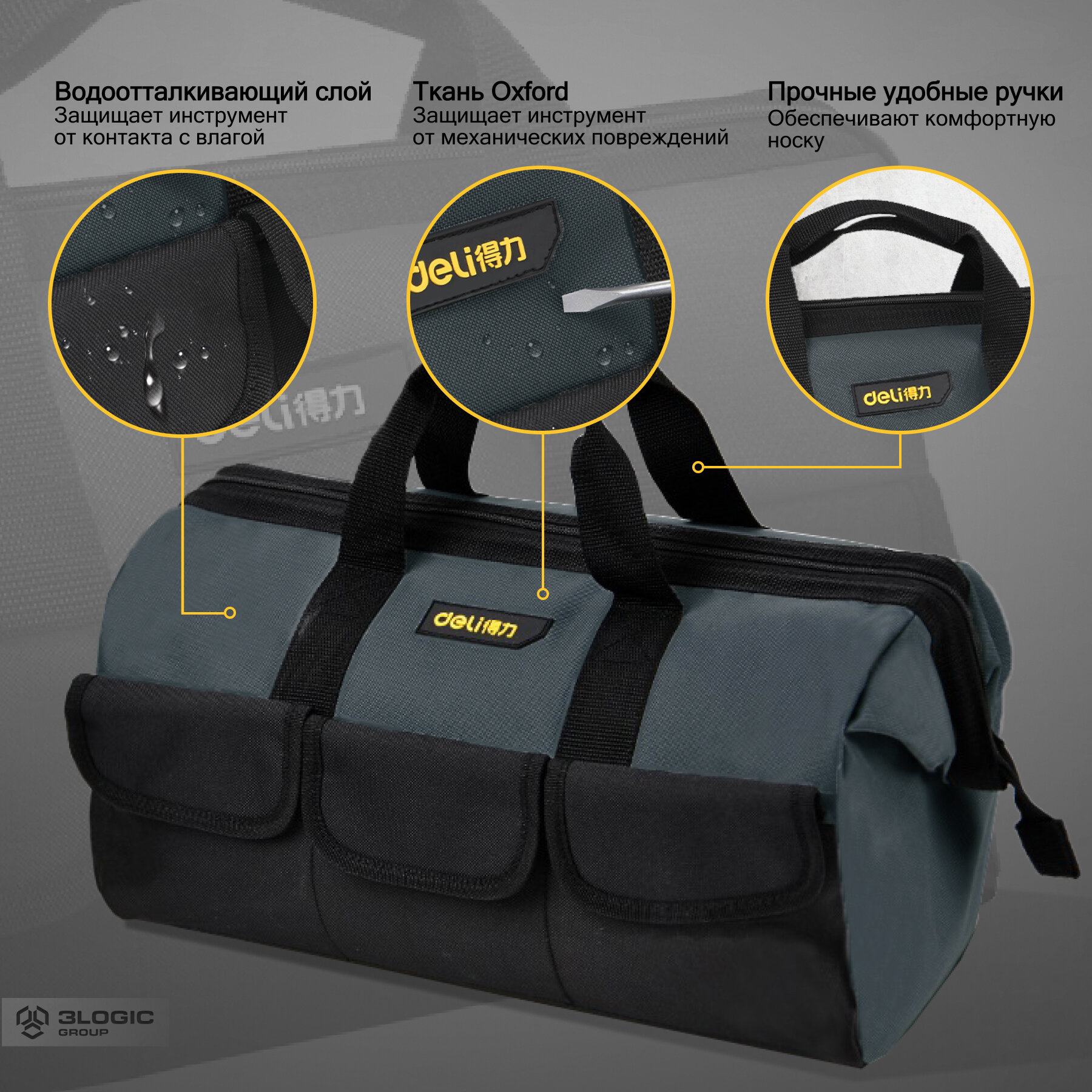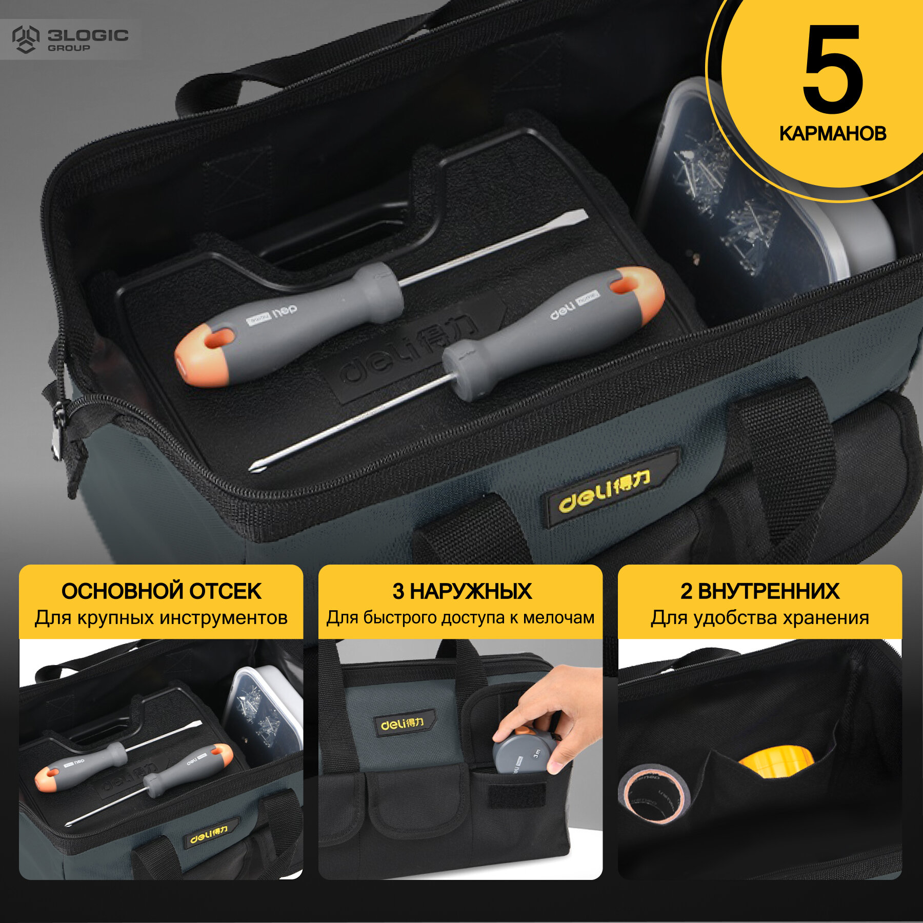 10 цен на DELI Сумка для инструментов DL430016 360x180x250 мм (ткань oxford, 5 карманов, армированная) 130331