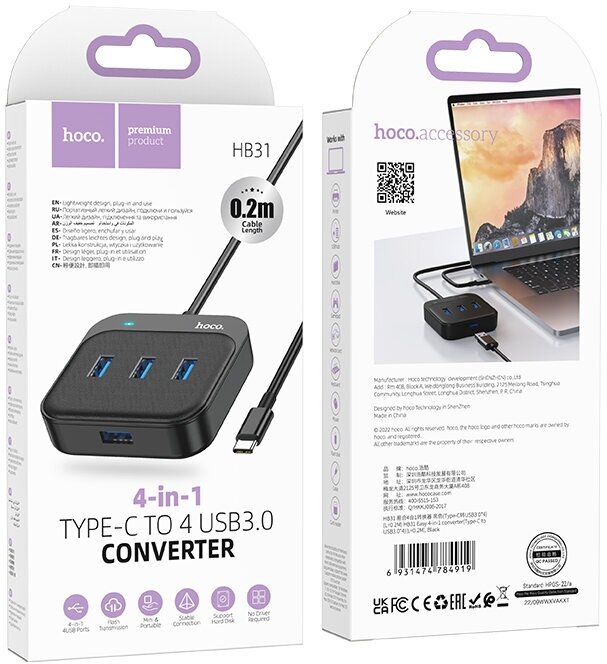 USB Хаб (HB31) с 1 Type-C на 4 USB 3.0, L=0.2M, HOCO, черный информация: