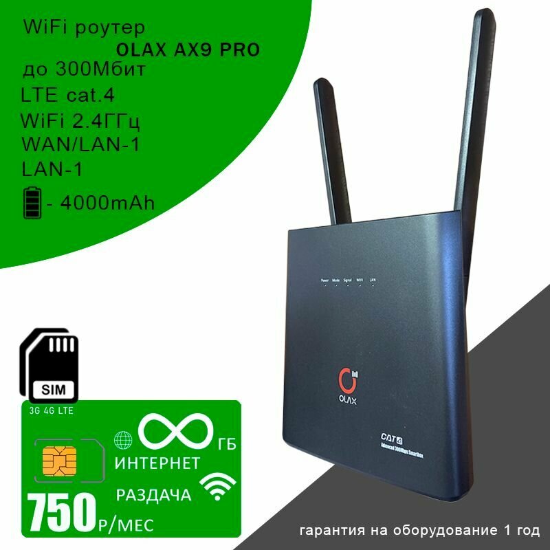 Роутер OLAX AX9 PRO black I АКБ 4000mAh + сим карта с безлимитным интернетом и раздачей за 750р/мес информация:
