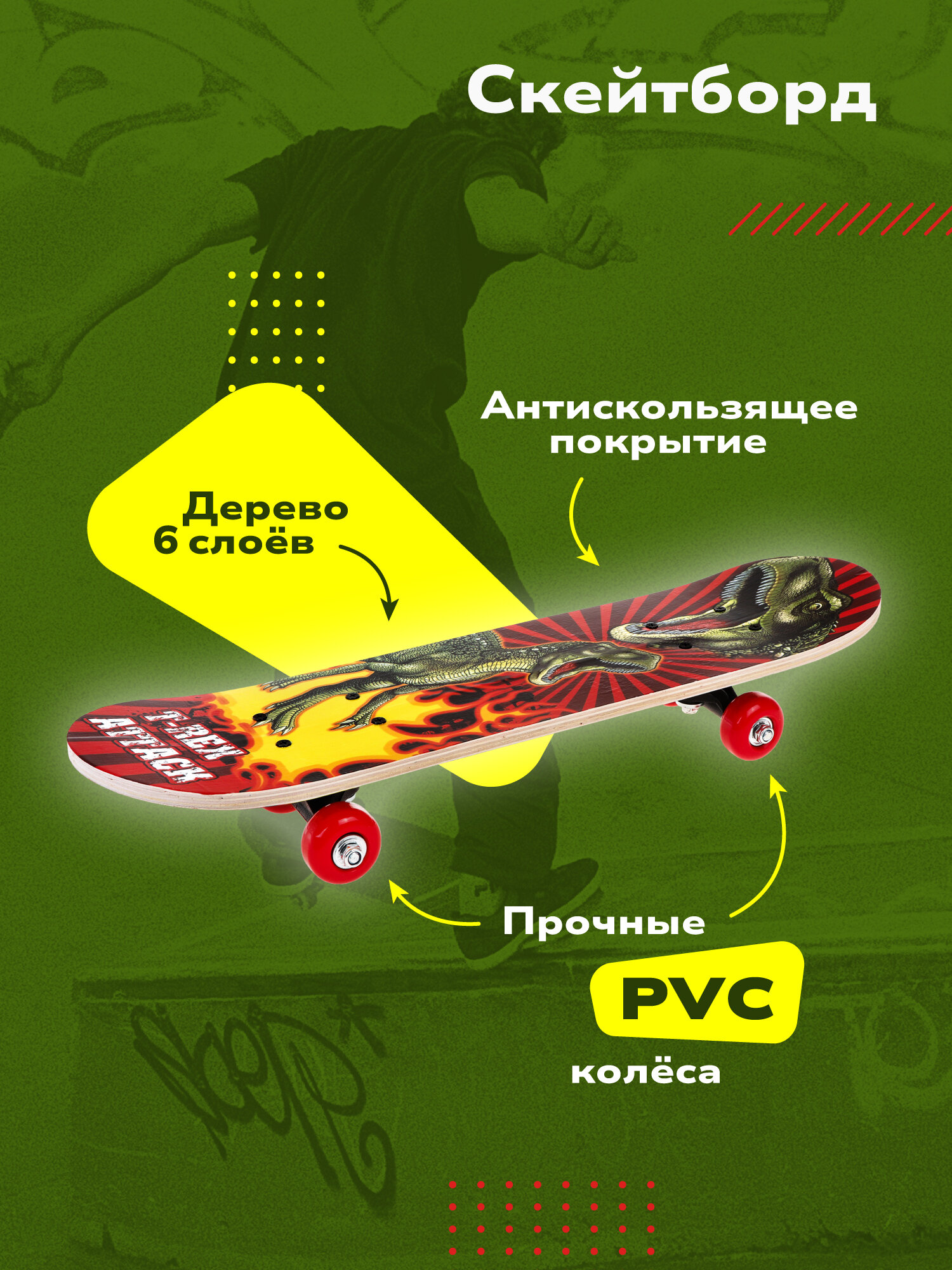Отзывы на Скейтборд дерев., PVC колеса без света 60*15 см. макс. нагрузка до 30 кг., Принт T-Rex