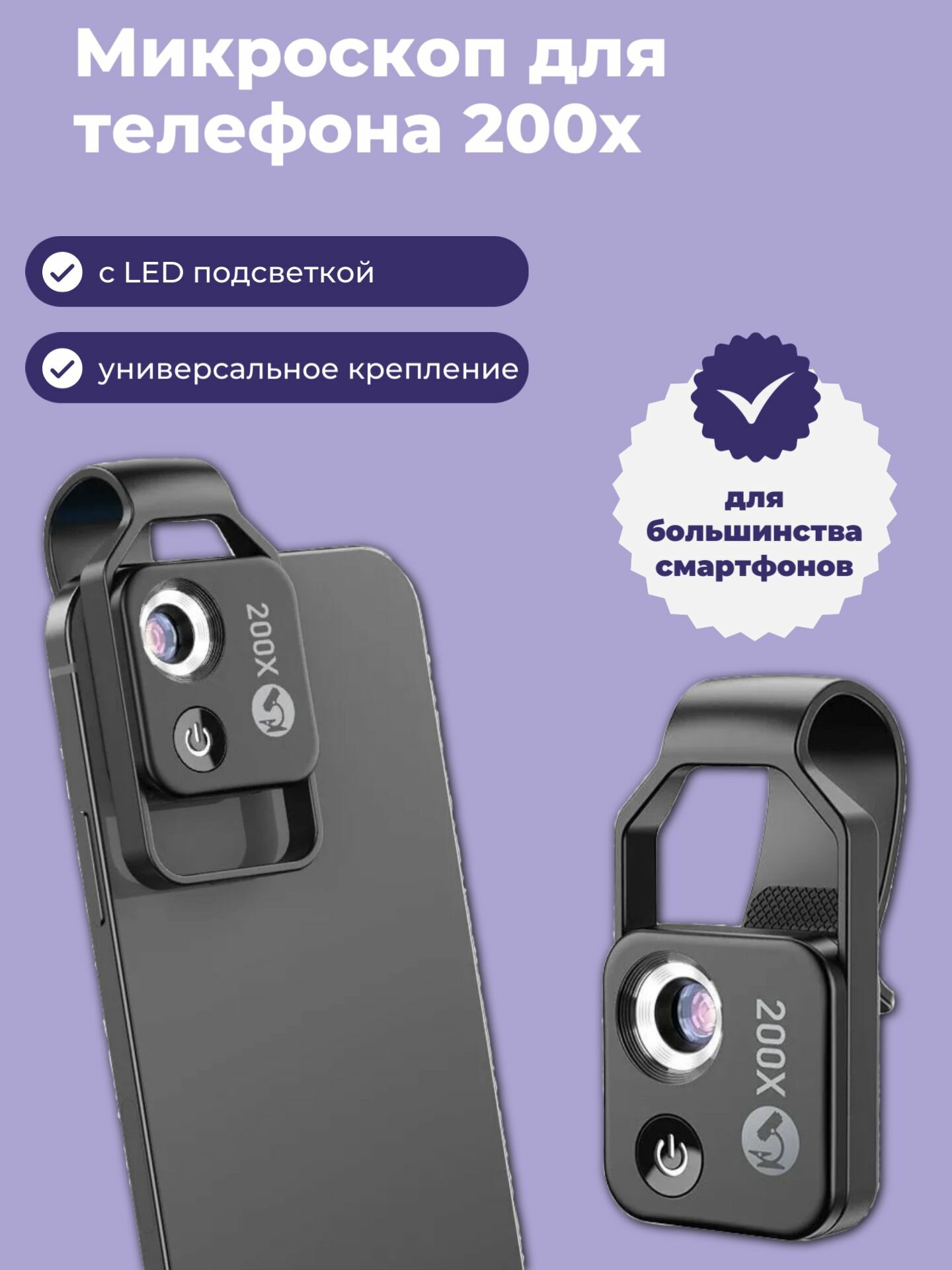 Микроскоп для телефона 200x с LED подсветкой и универсальным креплением, черный информация: