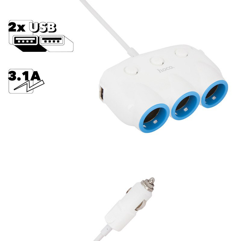 Автомобильный разветвитель HOCO C1 2xUSB, 3.1А, 3 гнезда прикуривателя, 0.55м (белая) информация: