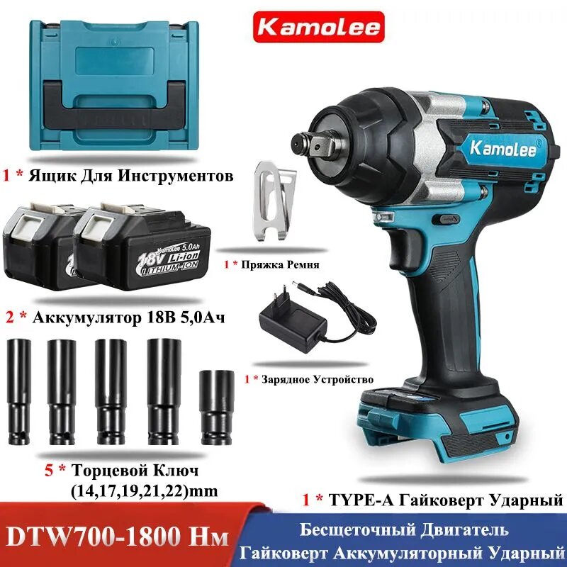 Бесщеточный ударный гайковерт Kamolee в кейсе, 2 аккумулятора 5 Ач информация:
