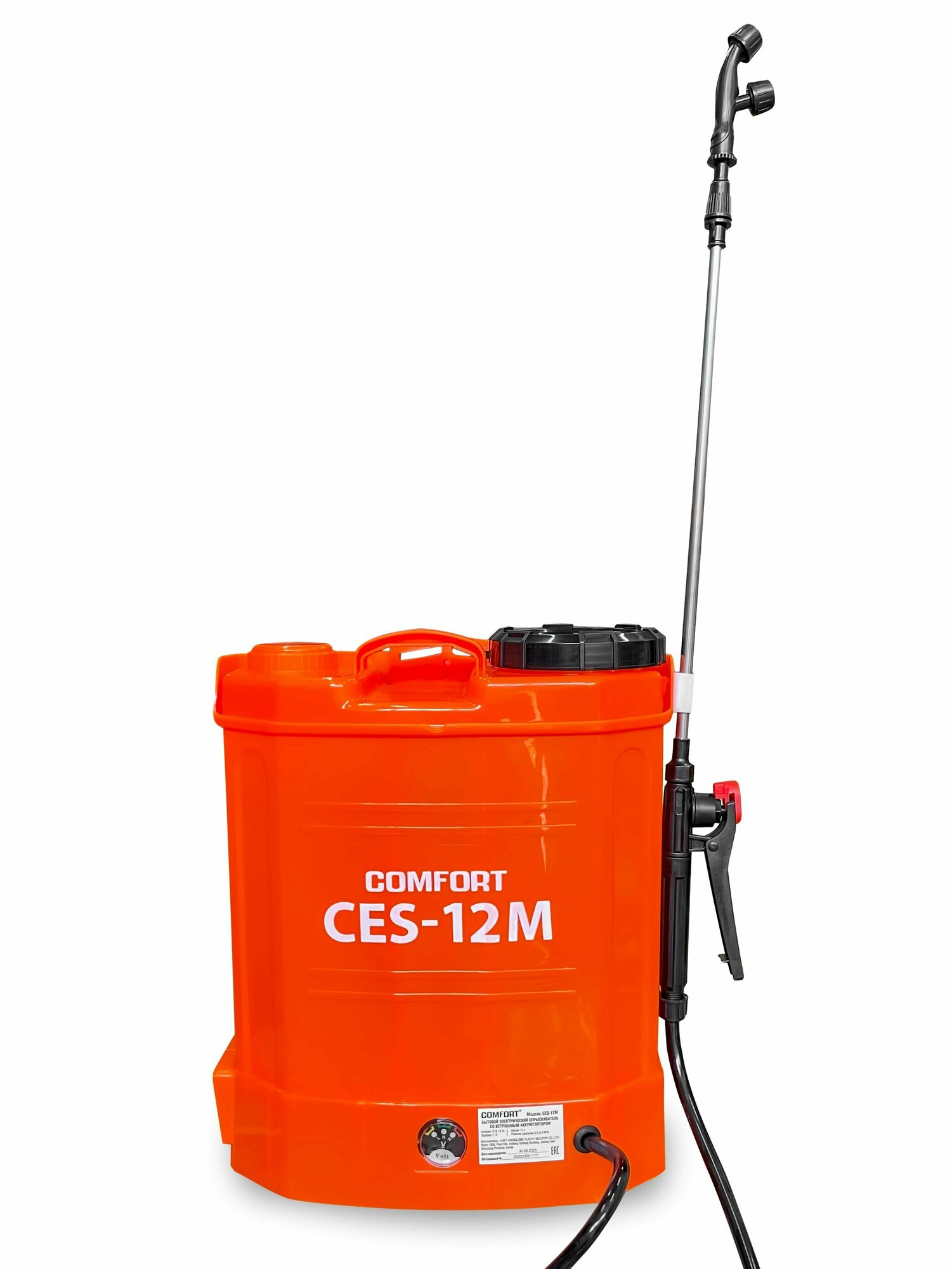 Бытовой ранцевый электрический опрыскиватель Комфорт CES-12M,оранжевый 12 л (нержавеющая удочка,с регулятором расхода) информация: