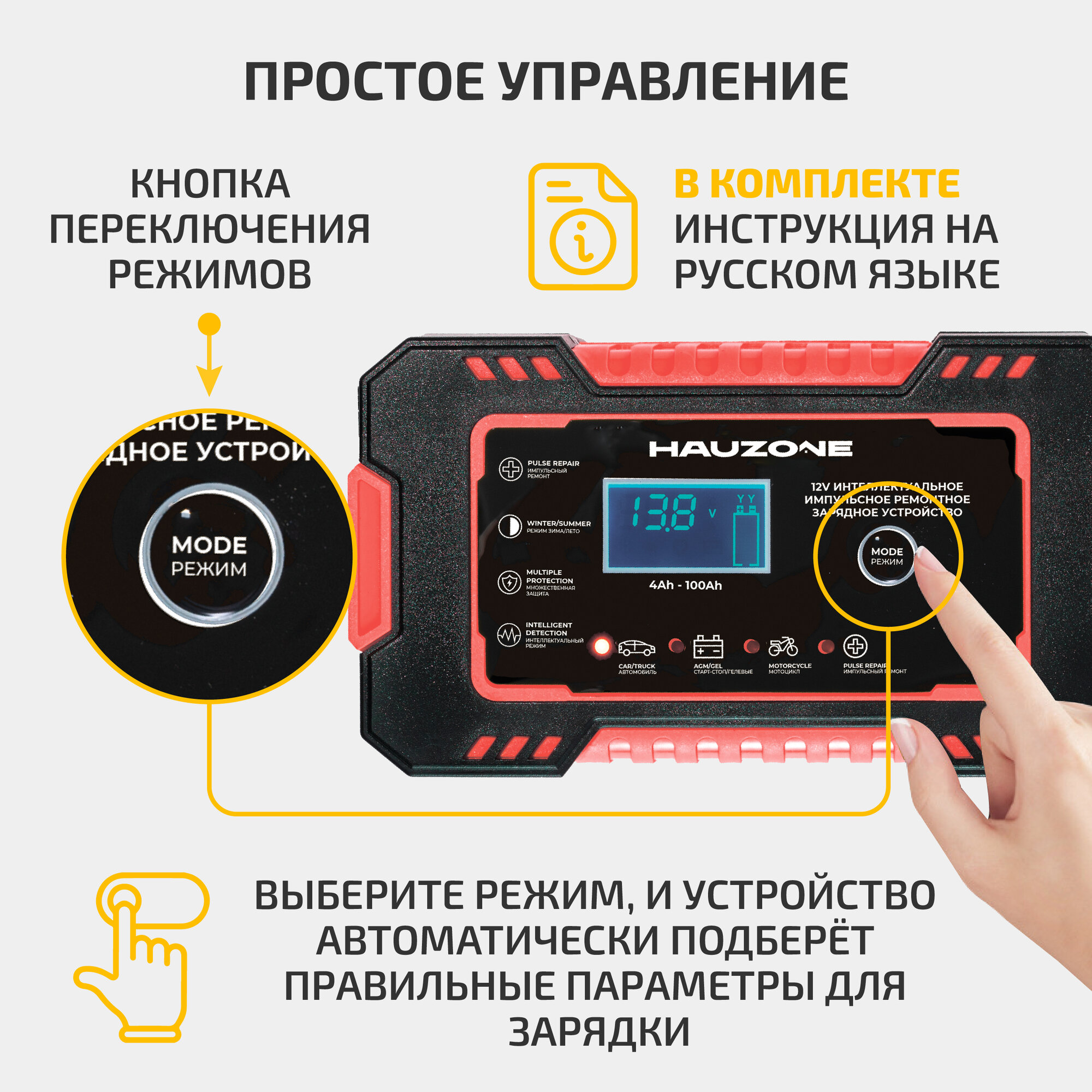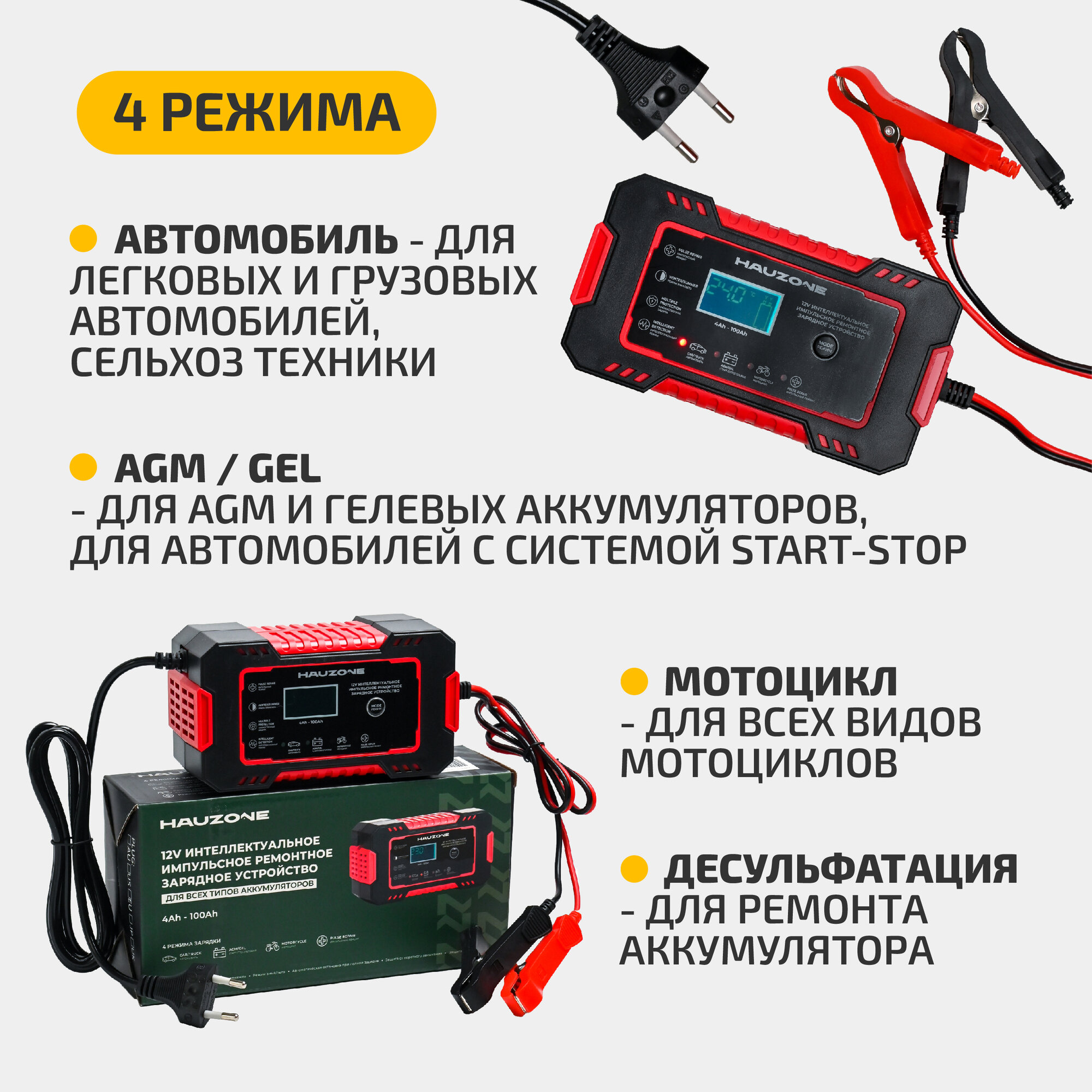 | Функции | автоматическое отключение зарядки / подходит для AGM/GEL аккумуляторов / режим зимней зарядки |