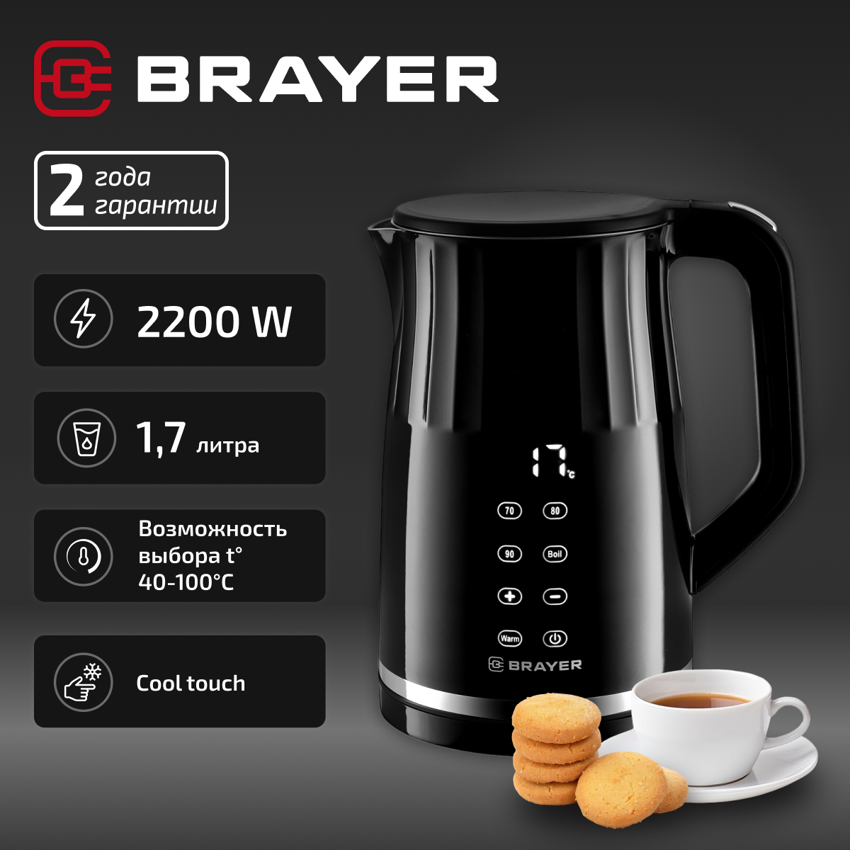 Чайник электрический BRAYER BR1035, 2200Вт, 1,5л, поддержания температуры, сенсорное управление, STRIX, черный
