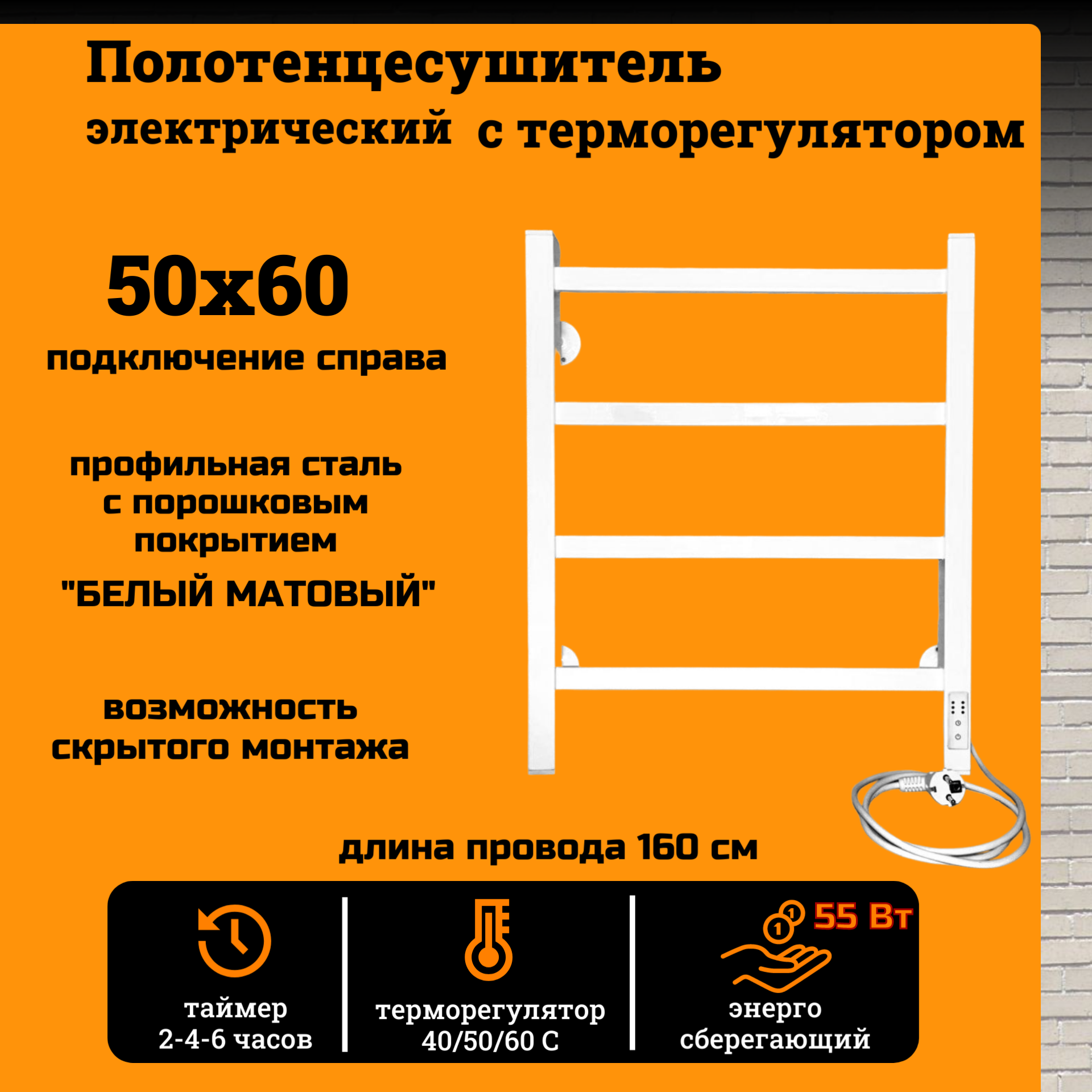 Полотенцесушитель электрический РуДизайн Лесенка профиль 500*600 белый матовый, 55 Вт, таймер и подключение справа информация: