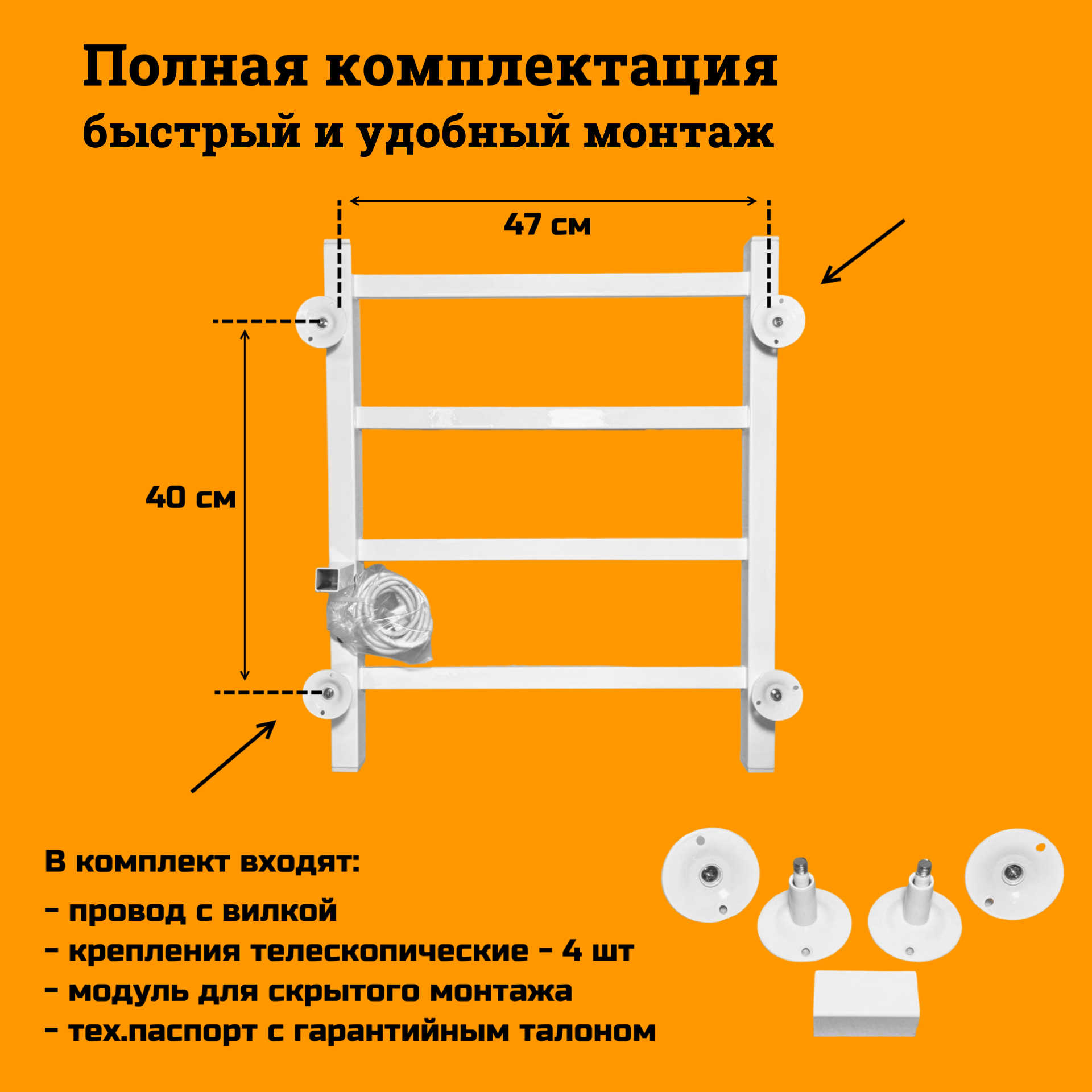 | Дополнительная информация | Данная модель позволяет рационально расходовать электроэнергию, путем регулировки температуры терморегулятором и делает эксплуатацию полотенцесушителя удобной и рациональной, позволяя экономить до 30-40% энергии по сравнению с приборами, работающими постоянно. Температура нагрева регулируется в диапазоне 40-60 градусов ступенчато в 3х режимах: слабый нагрев 40 С, средний нагрев 50 С, максимальный нагрев 60 С. Так же есть возможность выставить таймер отключения. В соответствии с выбранным временем загорится соответствующий светодиод: 2 часа, 4 часа, 6 часов |