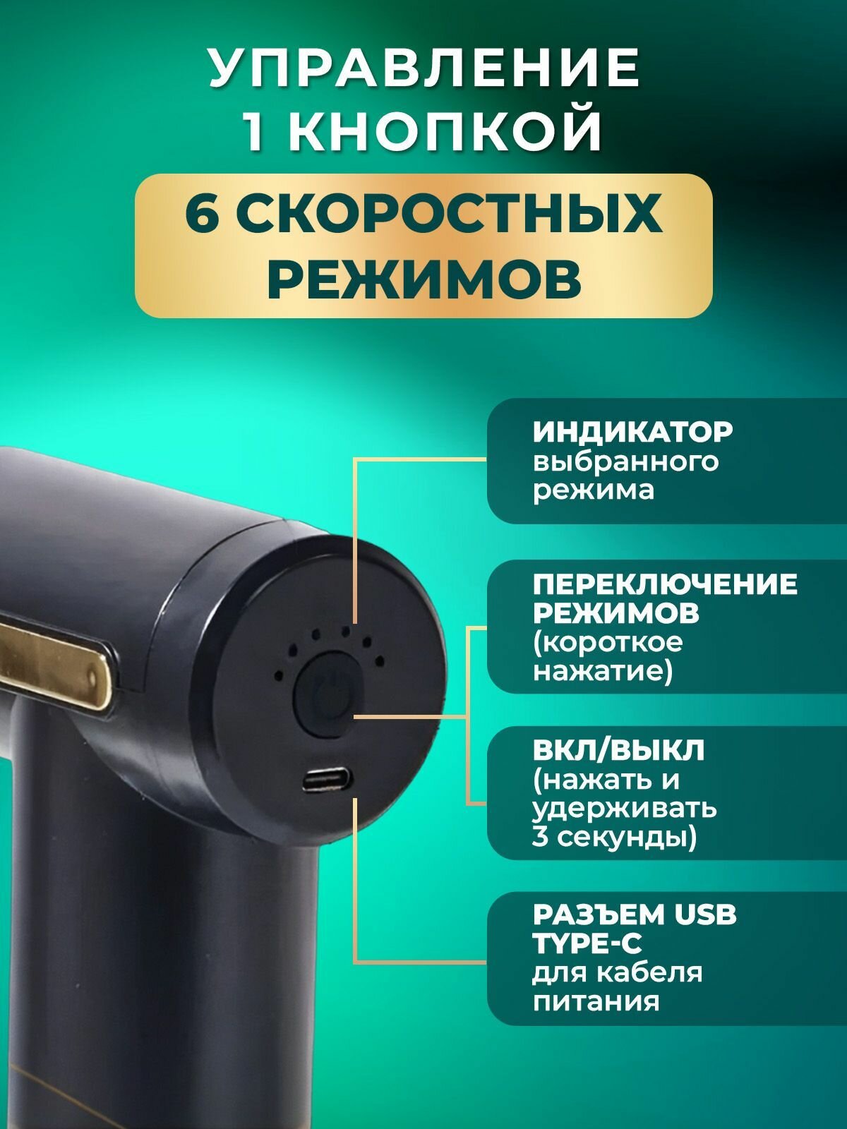 Перкуссионный массажер для тела Classmark беспроводной массажный пистолет электрический для ног, рук, шеи и спины, 4 насадки на все группы мышц, 6 режимов работы, разъем usb type - C, черный информация: