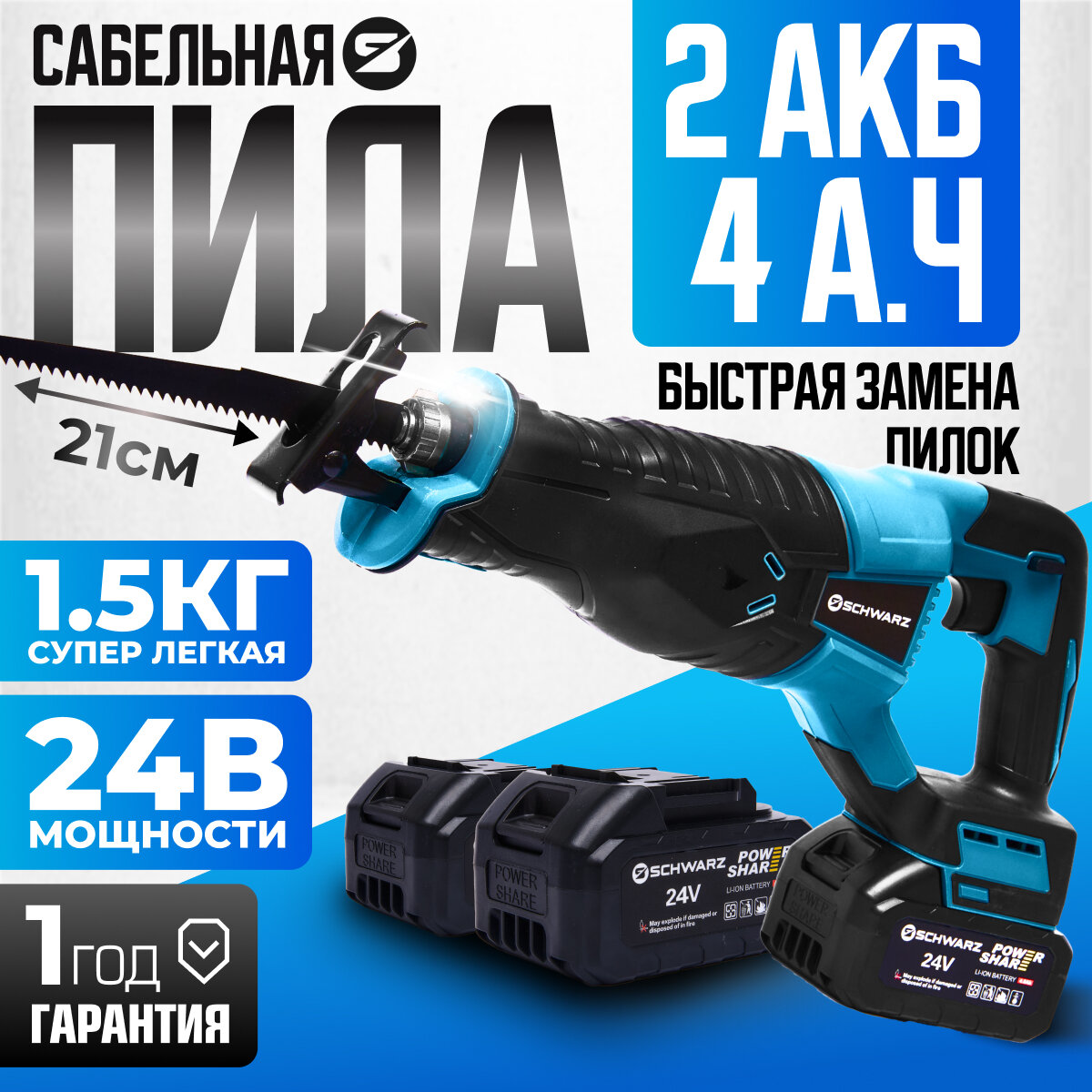 Сабельная аккумуляторная пила Schwarz , садовая, профессиональная, кусторез, сучкорез, 24В информация: