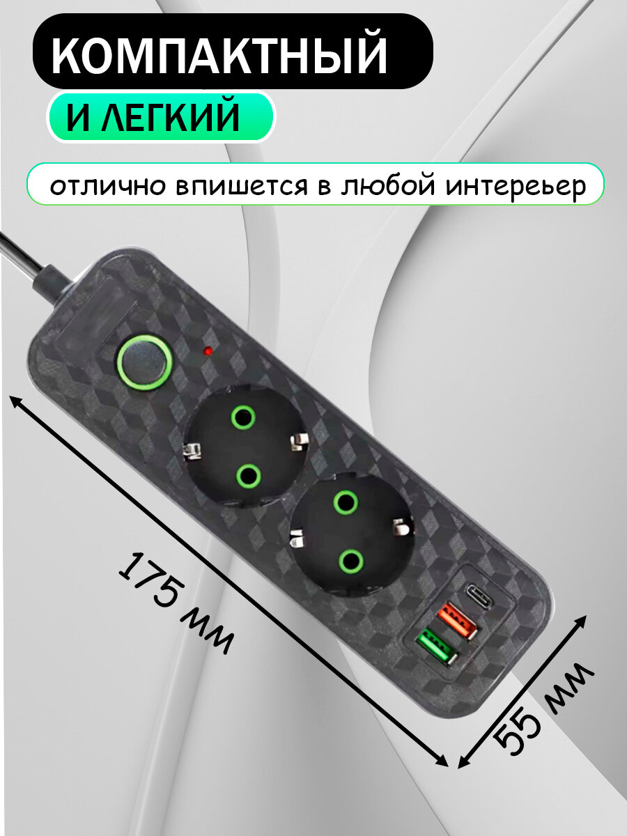 Безопасный сетевой фильтр удлинитель 8 розетки, USB и Type-C 592 ₽