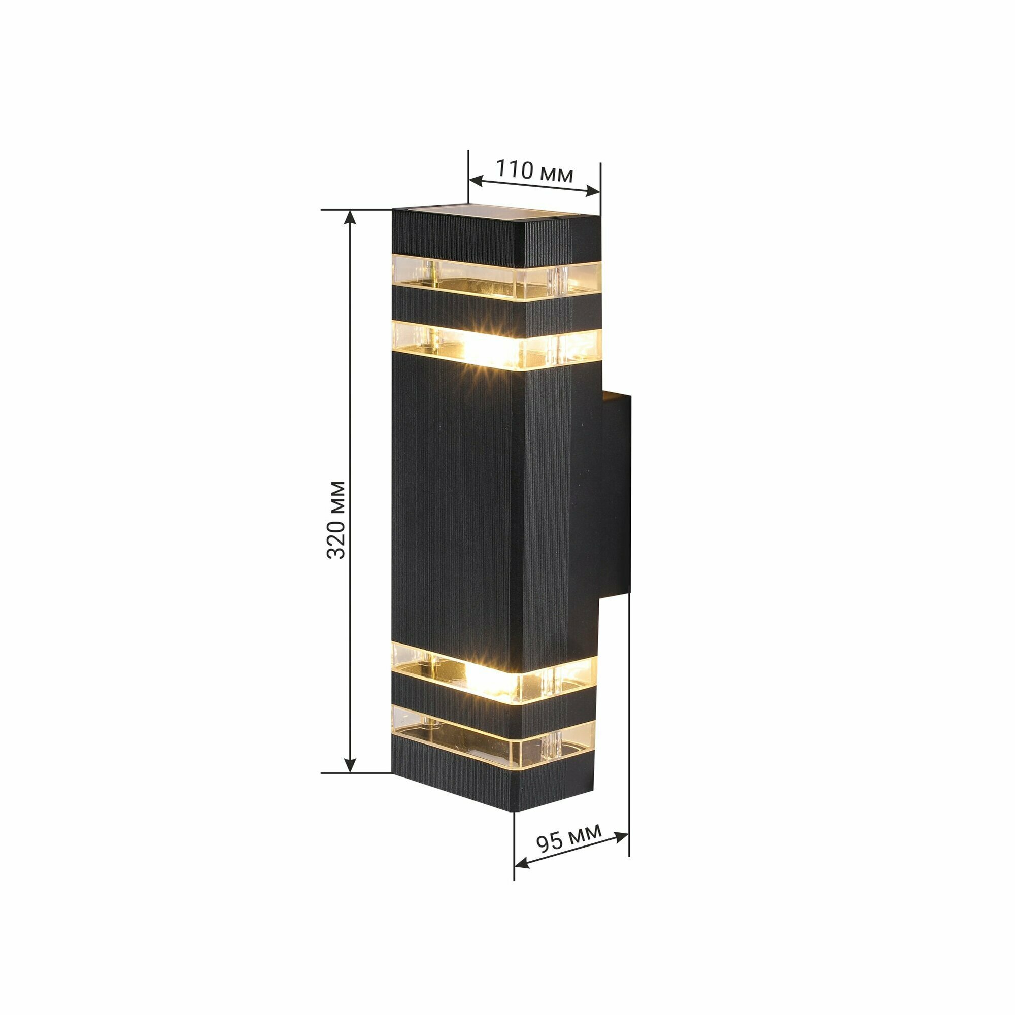 10 цен на Св-к настенный, накладной, TECHNO, 110х95х320мм, 2хЕ27, алюм/стекло, IP65, черный, 24395 3,