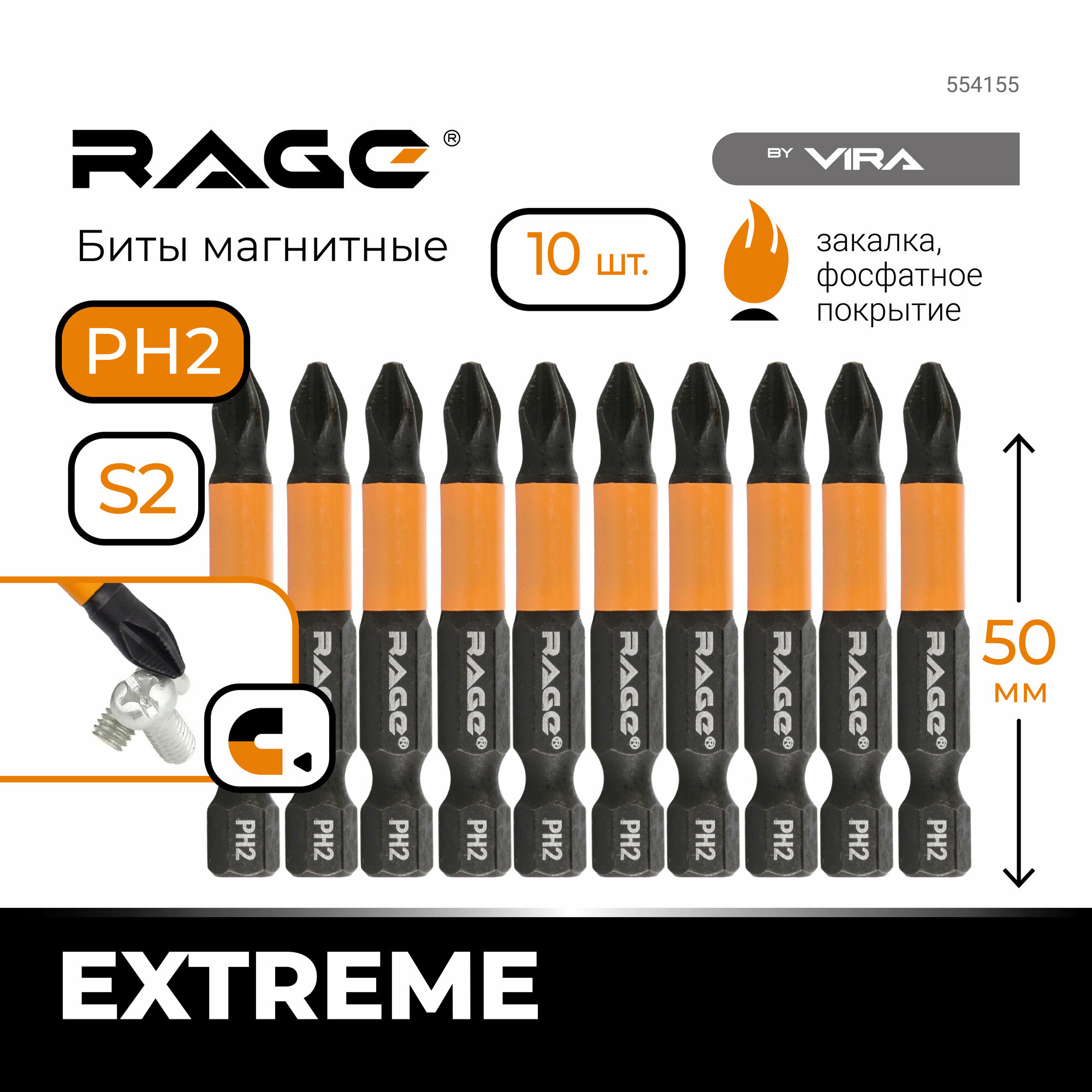 Биты магнитные PH2, 50 мм, 10 шт, S2 rage by VIRA 554155 информация:
