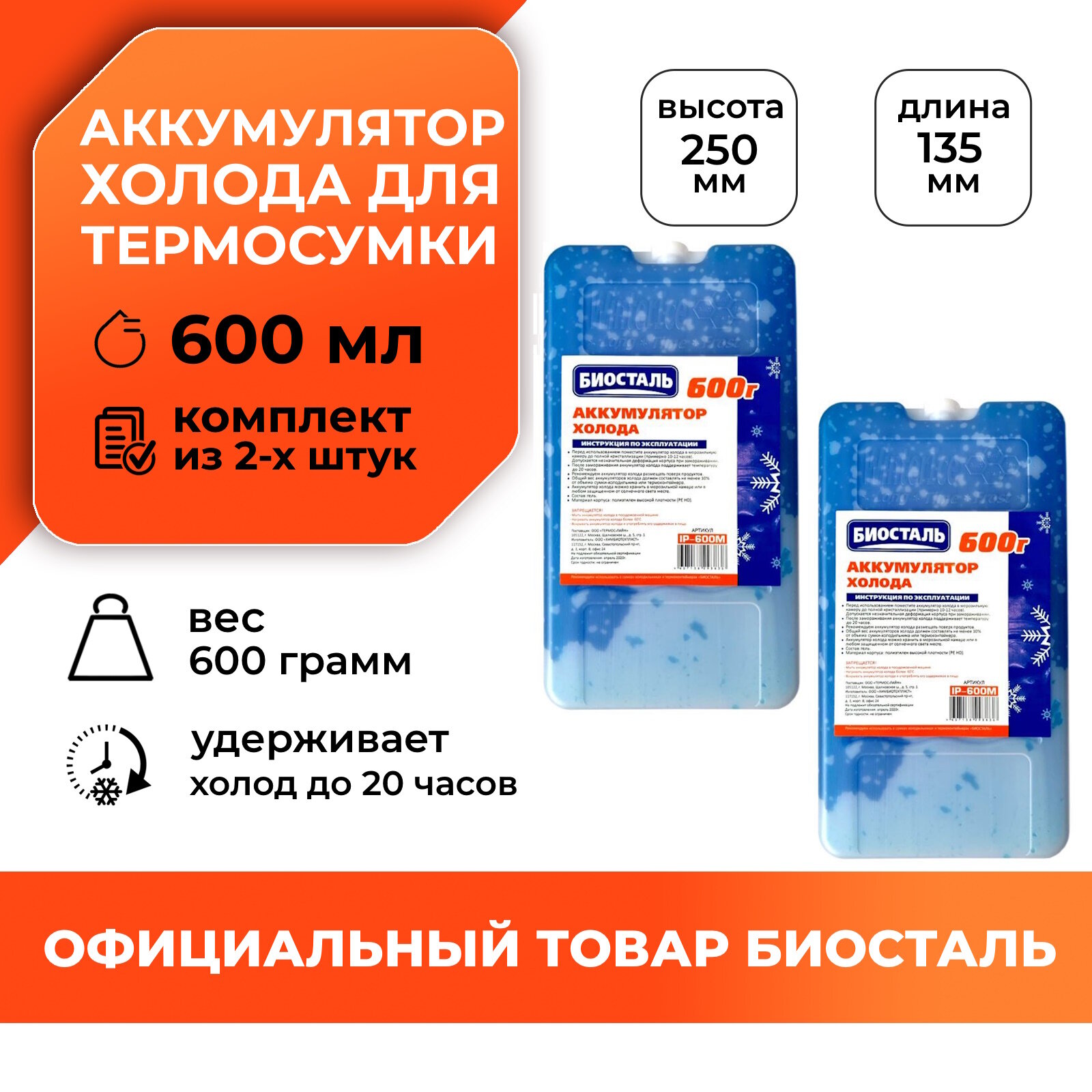 Аккумулятор холода гелевый, хладоэлемент для термосумки торнадо экстрим от Биосталь (600гр.) набор из 2 шт. информация: